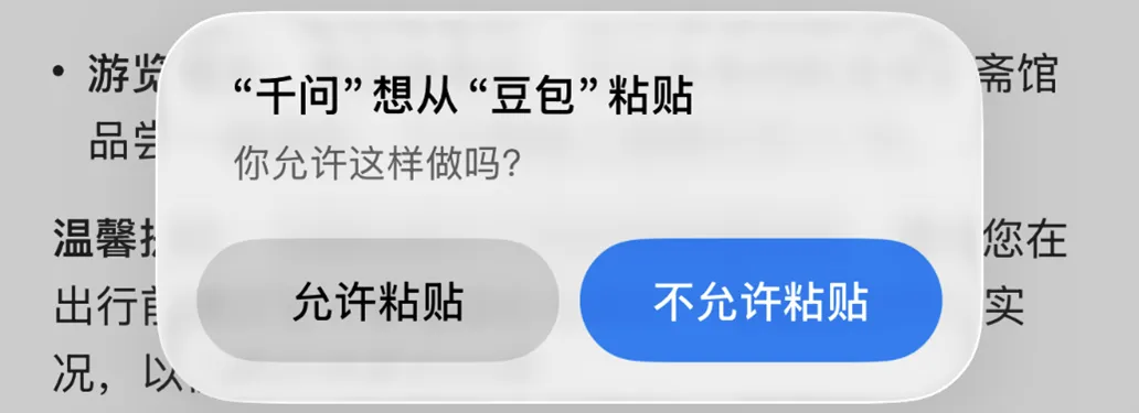 而千问APP默认读取手机剪贴板,这就导致每次复制粘贴了问题,打开千问APP时,手机(iPhone用户)都要弹窗询问:“千问”想从“XX”粘贴,请选择“允许粘贴”或“不允许粘贴”。假设用户选择了“允许粘贴”,而这时APP并没有在对话框自动粘贴问题,仍然需要手动长按粘贴一遍。比其他APP(例如豆包)凭空多了一道操作,流程变得卡顿。