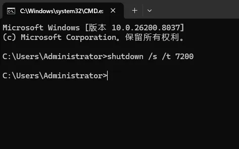 📌 说明:/s 表示关机,/t 7200 表示7200秒后执行(即2小时)。