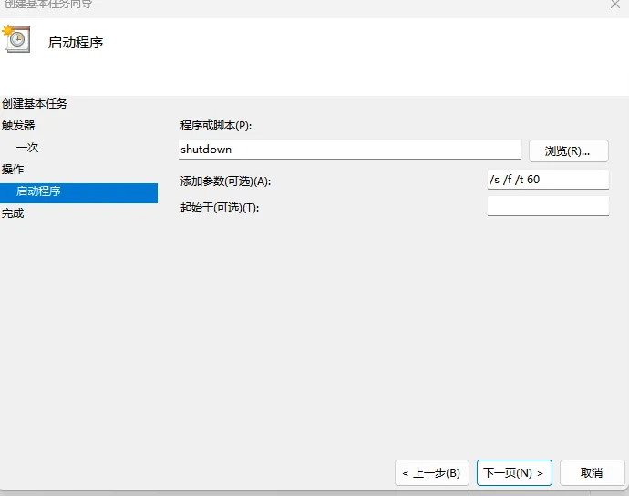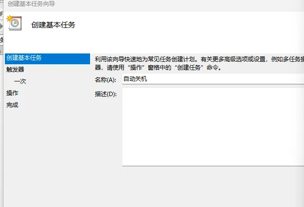 名称填“夜间自动关机”,下一步;