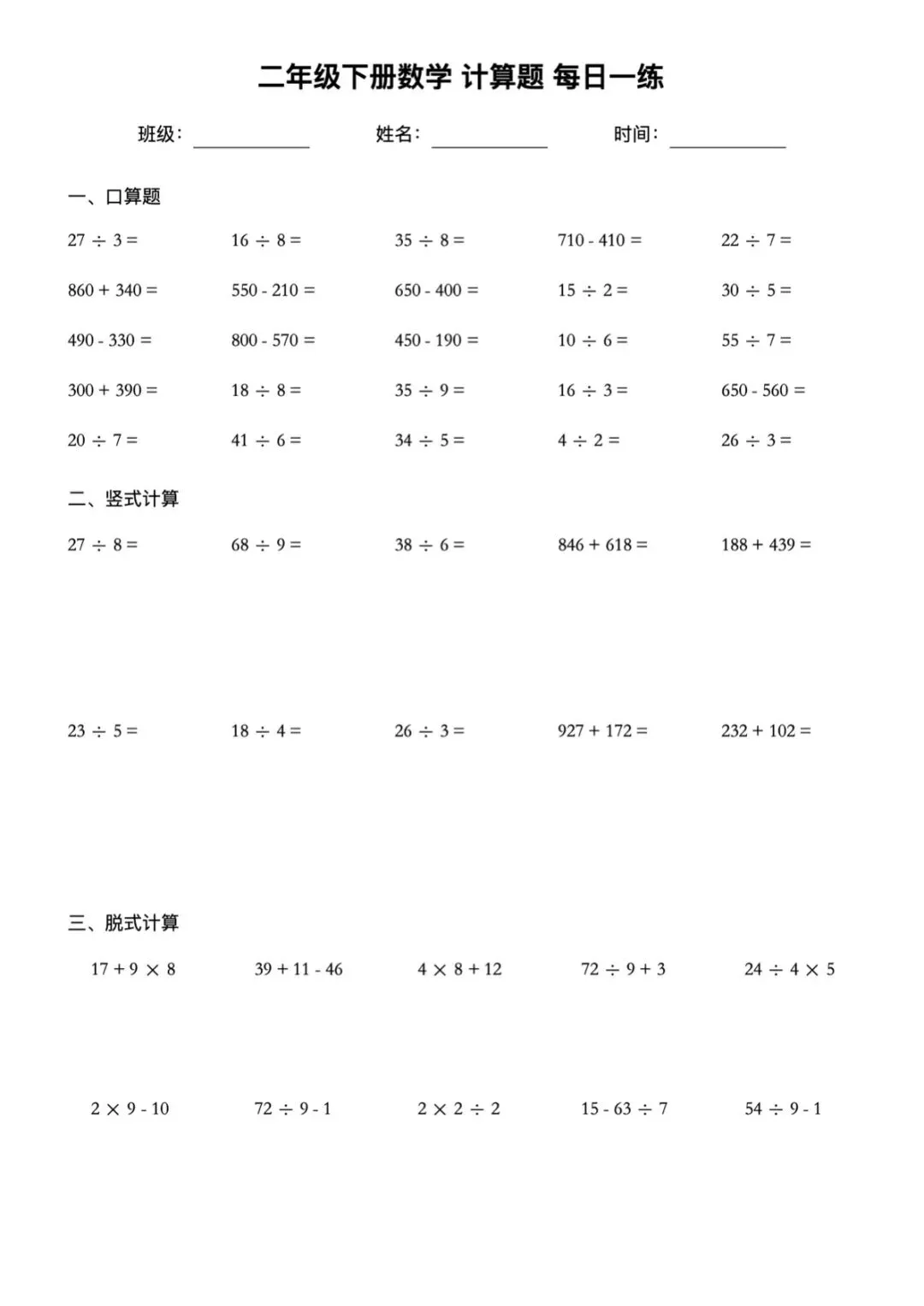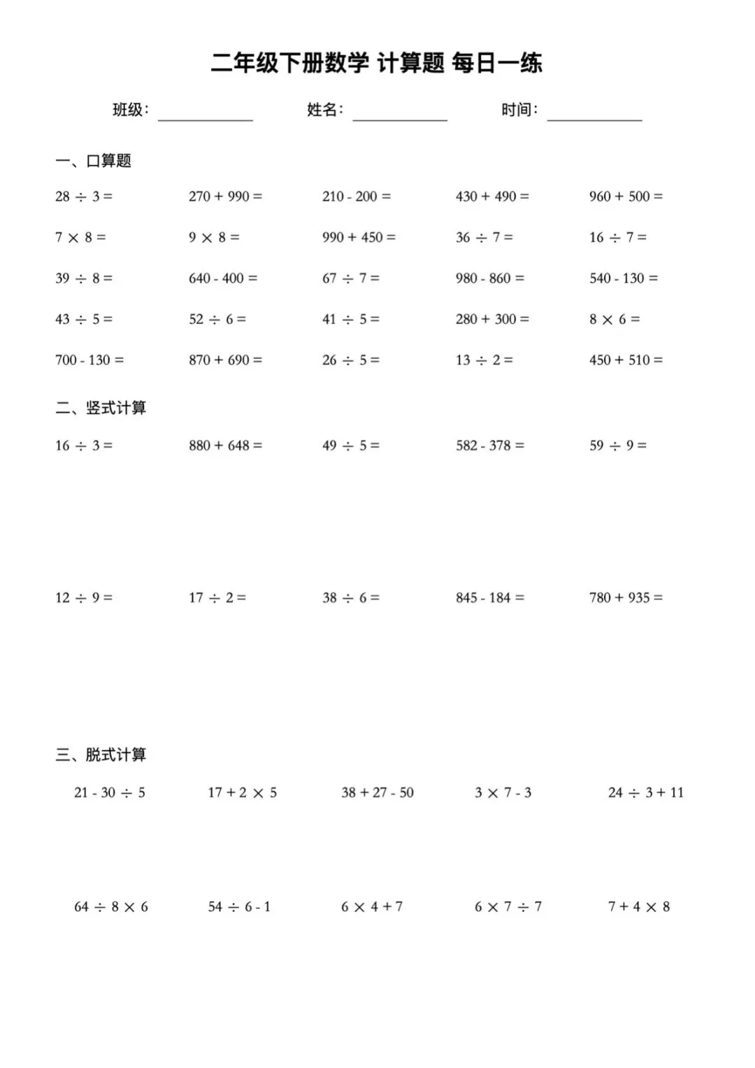二年级下册数学60天计算题每日一练电子版