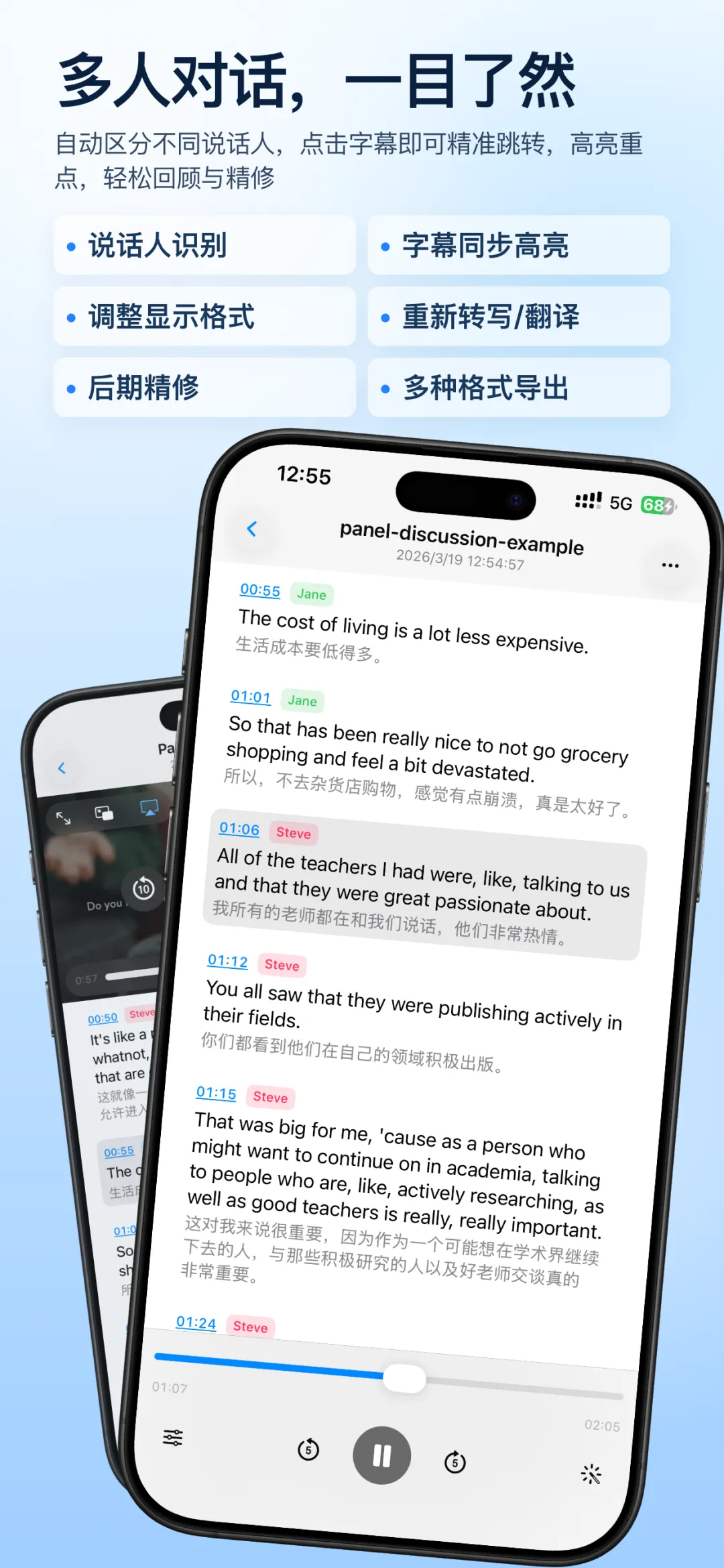 自动区分不同说话人,点击字幕可以跳转到对应位置,方便回看和精修。