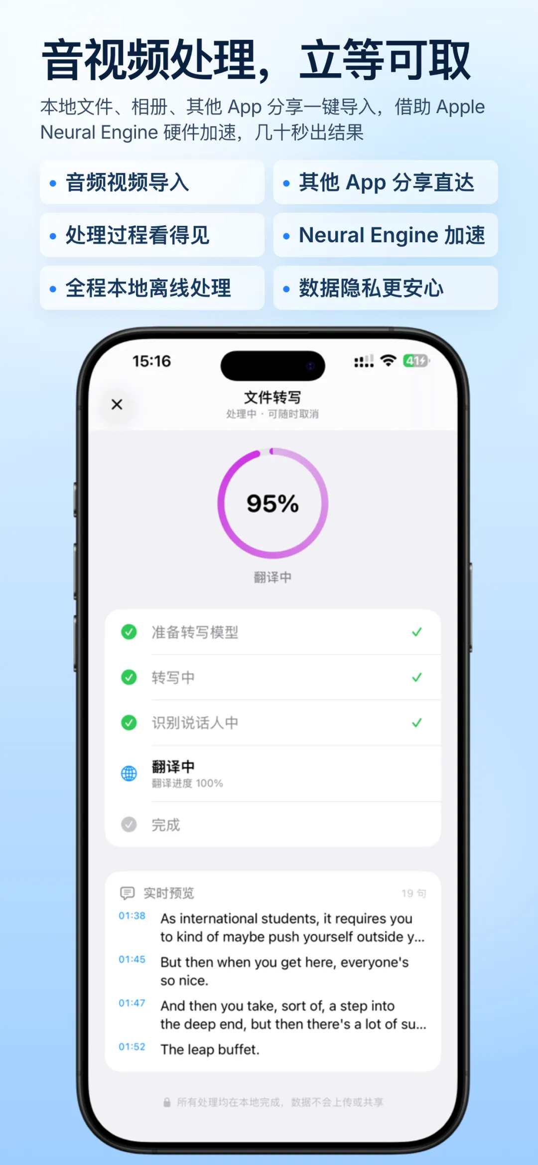 从文件或相册导入音频、视频,全程本地处理,进度实时可见。