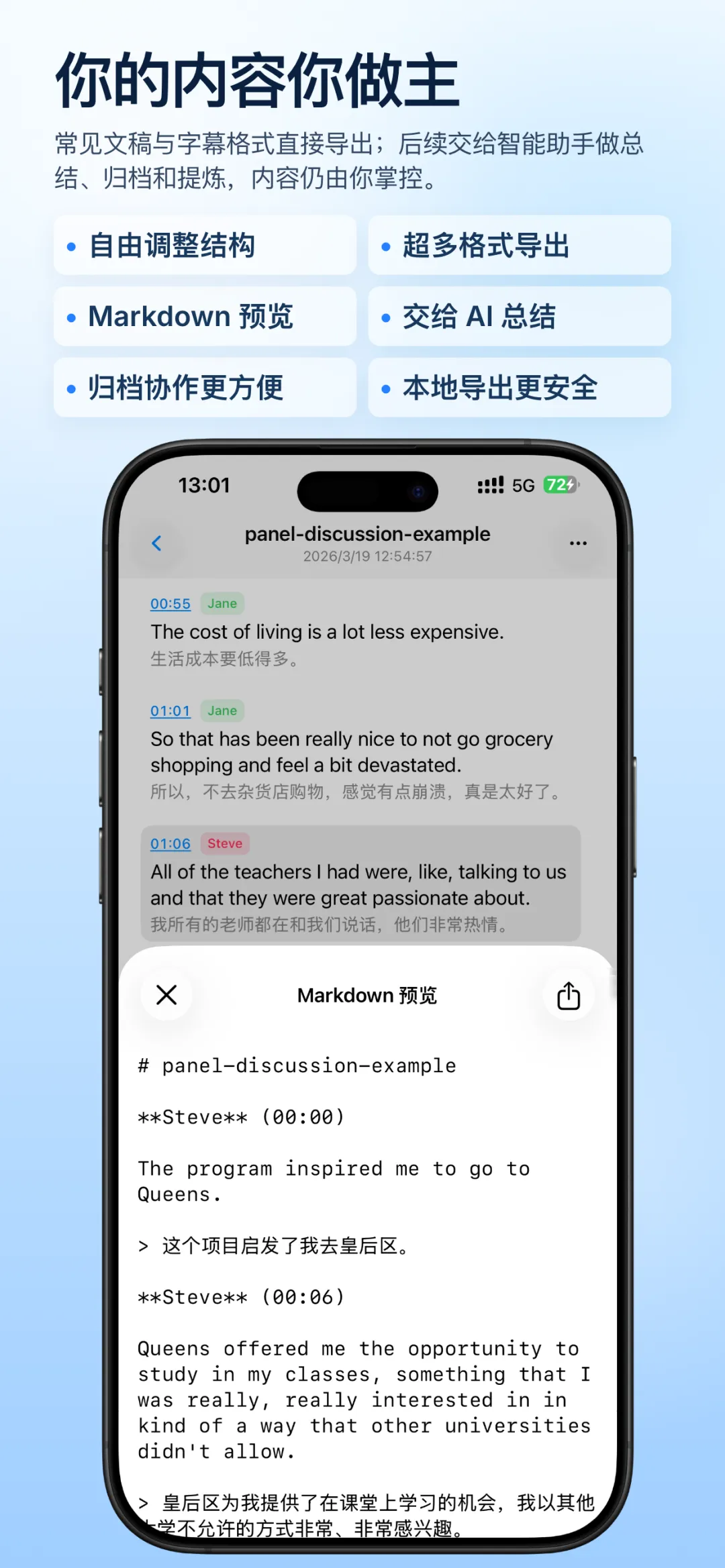 转写结果支持导出为 SRT 字幕或 Markdown,也可以直接在 App 内预览,方便交给下一步工作流。
