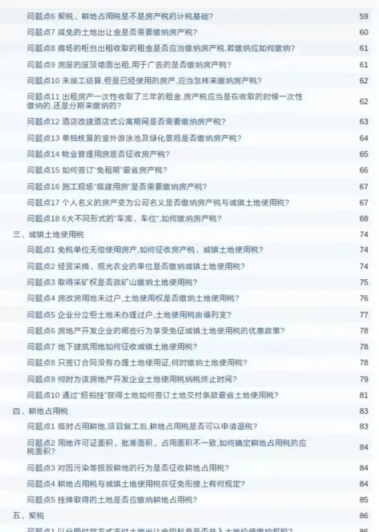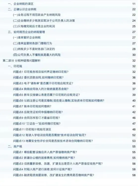 内容包括企业纳税误区、风险防范、分税种疑难问题解析、印花税、房产税、城镇土地使用税、耕地占用税、契税、增值税、企业纳税风险等,适合企业财务、税务、合规、法务学习参考。