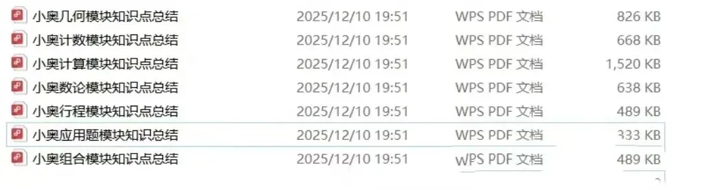 小学奥数知识点总结,PDF版,7个模块:几何,计数,计算,数论,行程,应用题,组合.