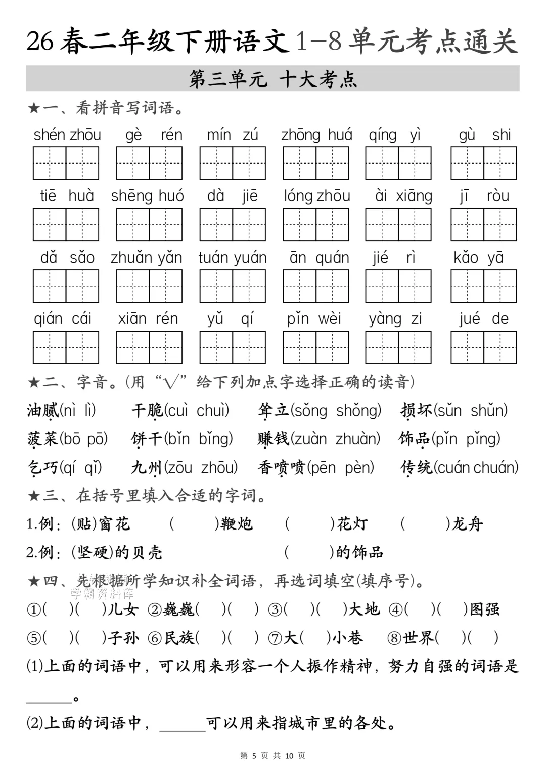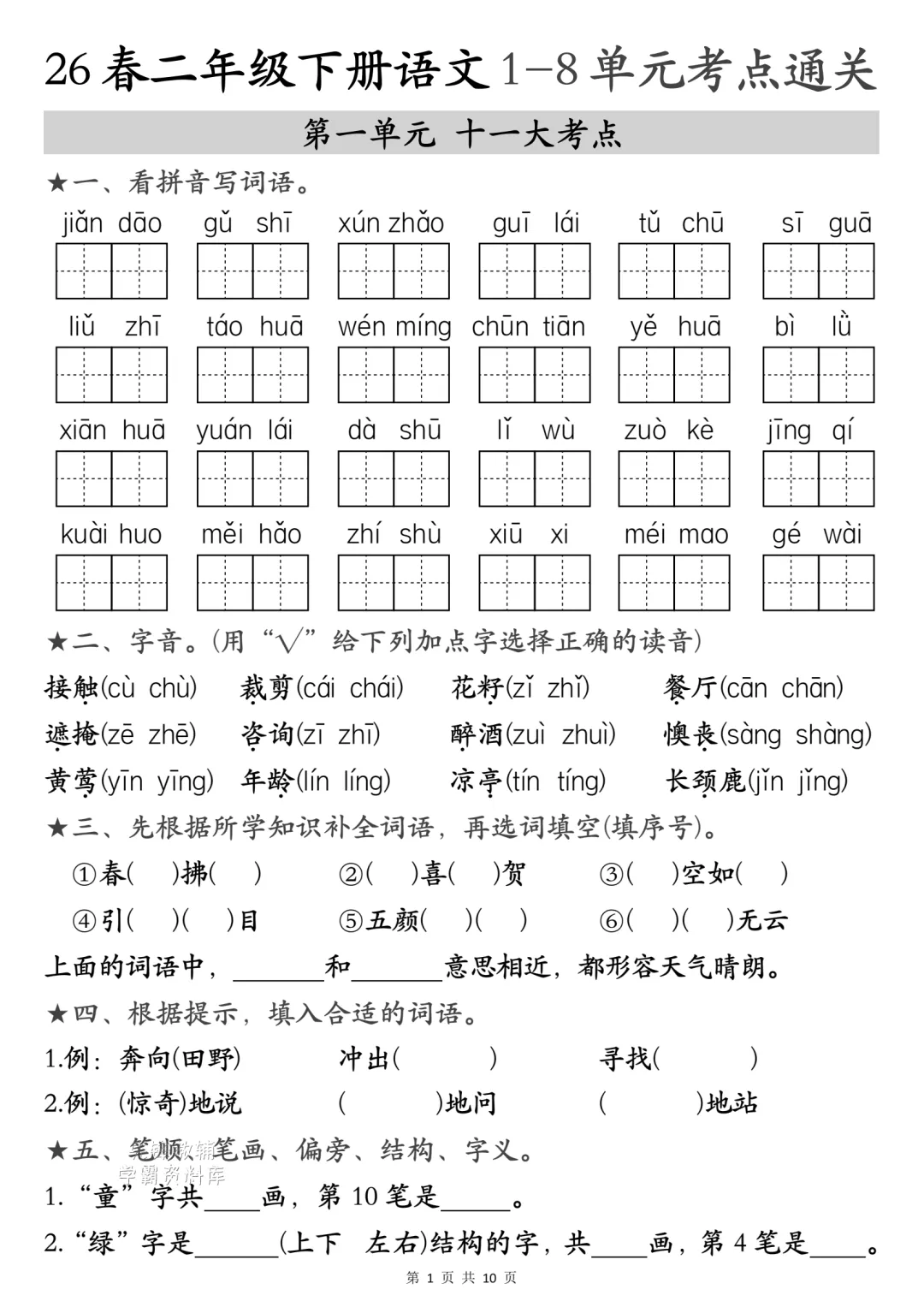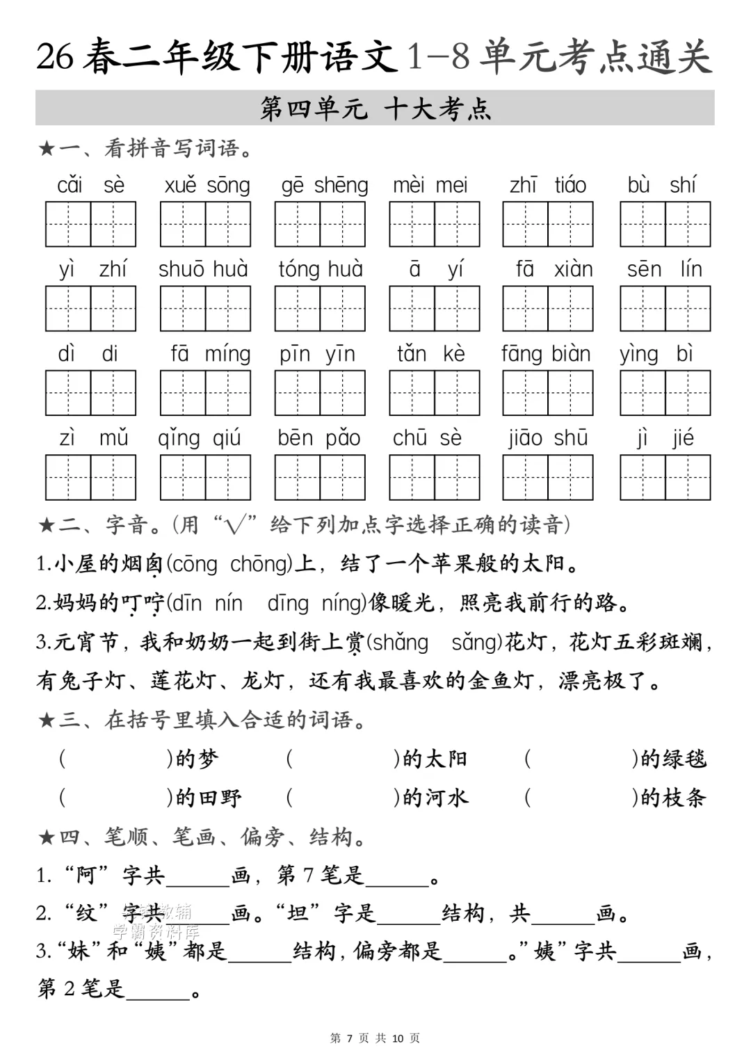二年级下册语文1-4单元考点汇(电子版可打印)