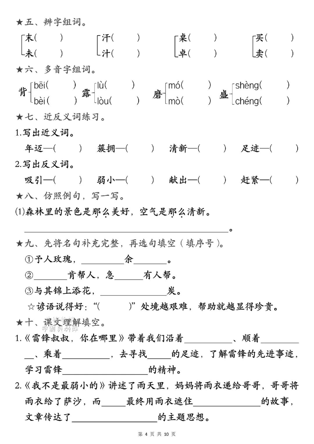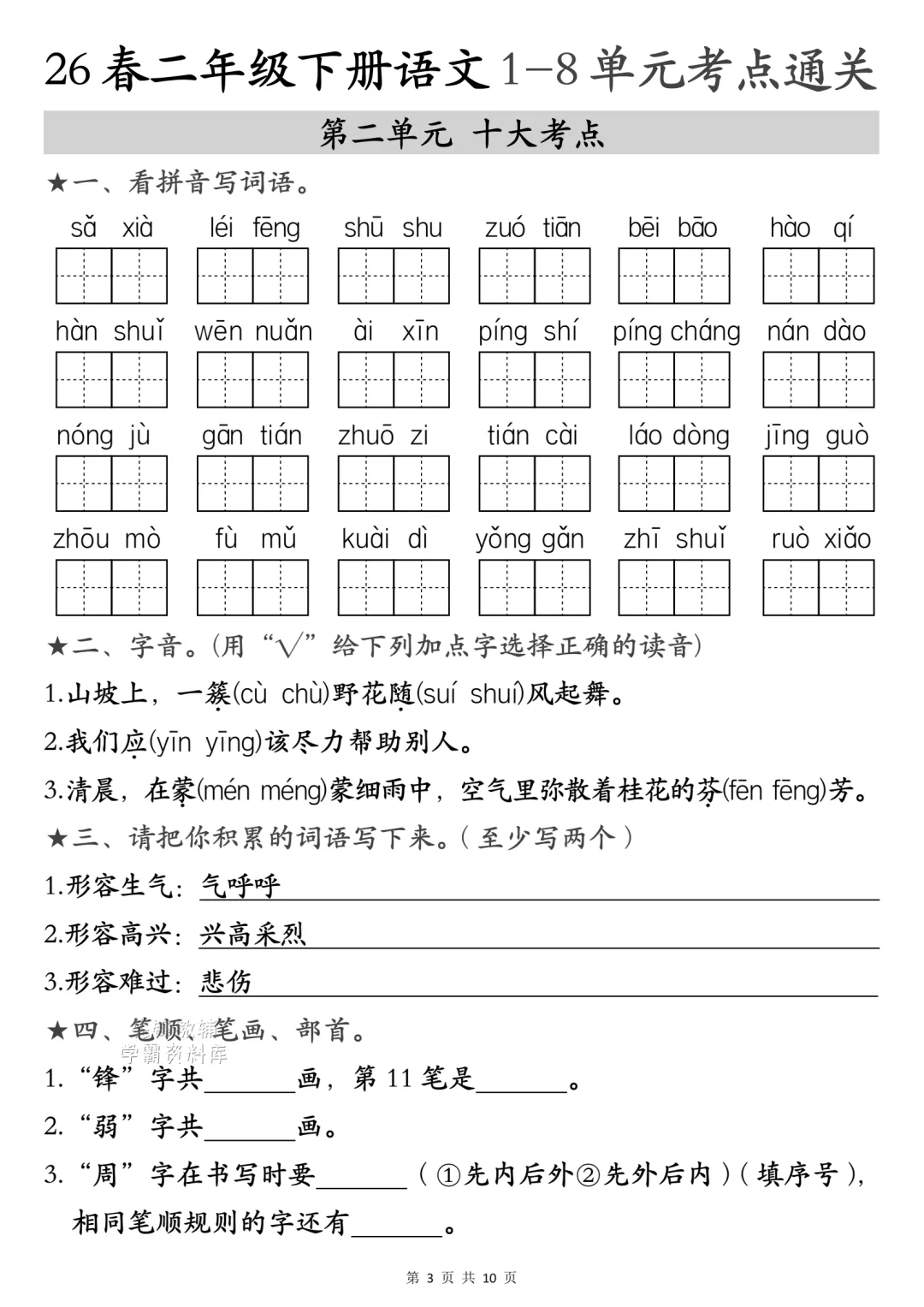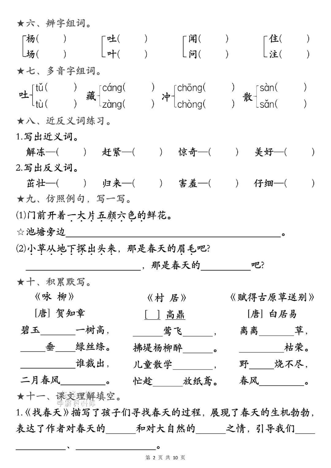 二年级下册语文1-4单元考点汇(电子版可打印)