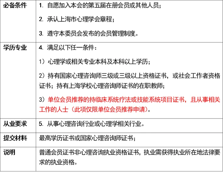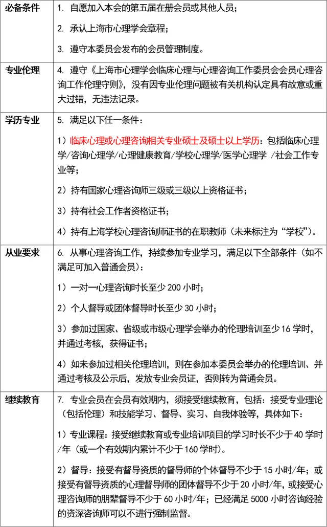 上海市心理学会临床心理与心理咨询工作委员会的会员还须遵守本委员会发布的会员管理制度、工作伦理守则等文件(在本委员会公众号正式发布)、会员申请资料须真实可信;否则将失去会员资格。