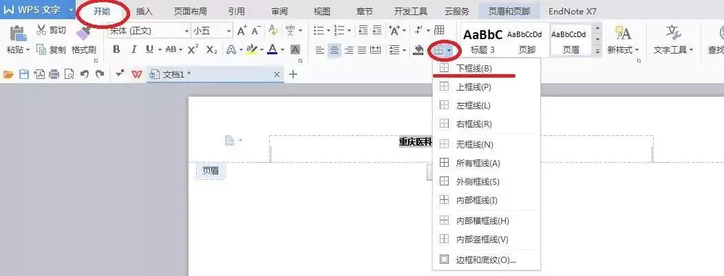 输入「重庆医科大学硕士研究生学位论文」,宋体,小五,加黑,不赘述。但是页眉下面有一横线,这要怎么解决?选中上面输入的文字,点击开始 – 边框 – 下框线。