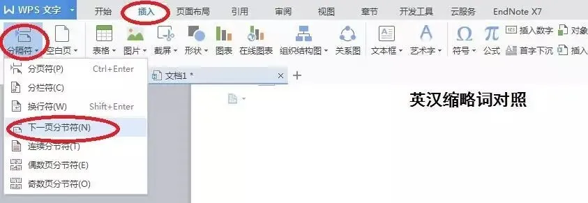 我们的页眉是从「英汉缩略词对照」才开始有的,但是有的同学设置的是从第一张就有页眉,双击页眉删除掉文字,后面的也全都删掉了,这个时候该怎么办呢?这就要用到我们神奇的分节符了,插入了分节符,分节符前后的内容格式才可以实现不一样。将光标移到「英汉缩略词对照」字段的最前面,点击插入 – 分隔符 – 下一页分节符。