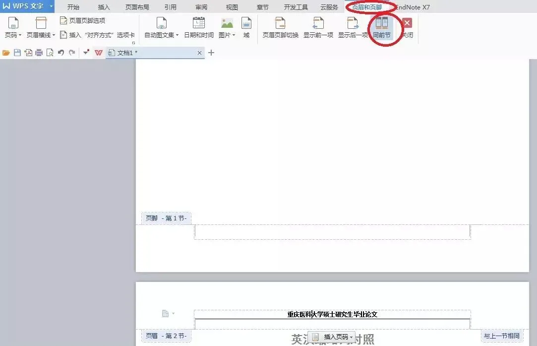 接下来再点击页眉,可以看到「页眉和页脚」里面的「同前节」,点击「同前节」,这下你就能随意修改本页之前的页眉了。