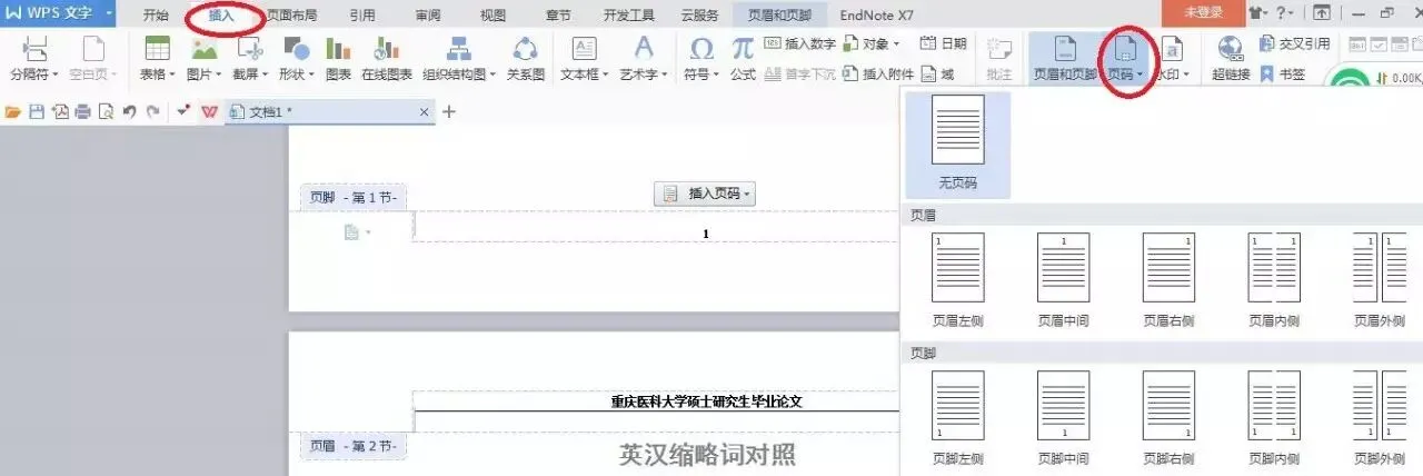 添加的方法和上面是一样的,双击页脚位置,添加上页码,或者插入 – 页码,里面有多种页脚页眉的位置可供选择。在论文中常见的问题和页眉一样,文章并不是从第一页就有页码,或者说插入页码以后每一页的页码都是一样的,这又要怎么办呢?