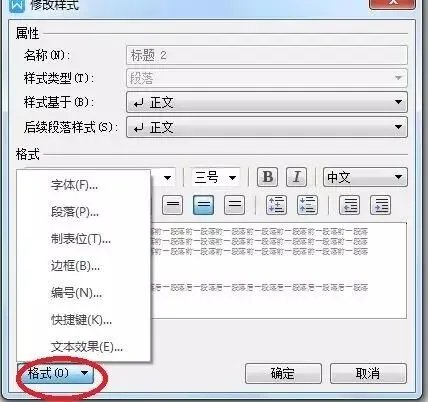 如果对里面已经有的样式进行修改,可以点击标题后面的下拉菜单 – 修改,会出现类似于新建样式的窗口,点击格式,可以修改里面的大纲级别、字体、字号、行距、位置、段间距、缩进量等。