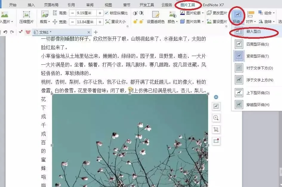 选择图片 – 图片工具 – 环绕 – 嵌入型,图片可以根据需要移动任何字段的位置,文字一直都是处在图片的上下位置。
