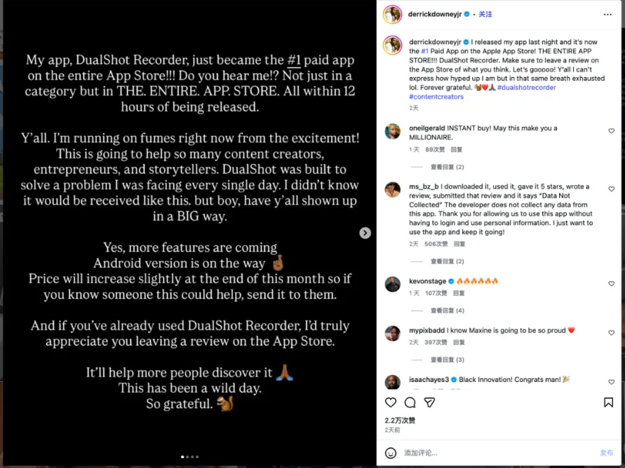 Derrick Downey Jr在Instagram上发布了一条视频,郑重地向大家介绍自己的最新作品——DualShot Recorder。在视频中,他熟练地拿起一个架着一横一竖两部手机的支架,向观众展示常规情况下内容创作者制作分别适配TikTok、YouTube视频素材的繁琐操作。随后,他打开了DualShot Recorder,这款App利用iPhone的后置双摄像头,直接生成了两个完美同步却不同构图的视频文件。整个过程,Derrick Downey Jr难掩兴奋之情,将这个App称为“Game Changer”(改变游戏规则者)。