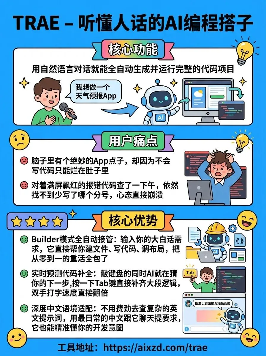 每天一个提效AI工具,今天是推荐的第279款。TRAE直接把这些麻烦砍掉:你只需要用中文大白话跟它提需求,它就能自动帮你建项目、写代码,跑不通的地方还会自己调试,看起来就像你真的雇了一个不知疲倦的高级工程师在帮你“代工”。它还能在你敲键盘时实时预测补全,遇到报错一键排查,让开发不仅高效还特别有趣。① Builder模式端到端全自动开发:不管是做网页还是小工具,输入一句话需求,它就能自动拆解任务、创建目录并写出完整的底层逻辑。从0到1的重活全包了,零门槛让新手小白也能轻松把创意变成真实可用的产品。