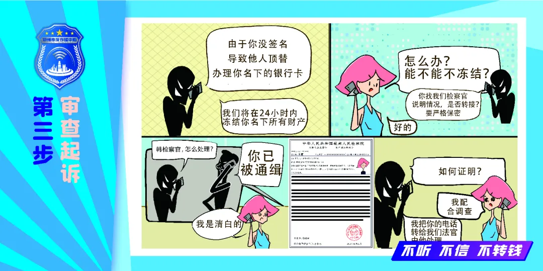 诈骗分子通常会扮演“警官”、“检察官”、“法官”等角色,制作所谓“逮捕证”、“通缉令”、“传票”进一步迷惑和恐吓受害人,以涉嫌洗钱、贩毒、拐卖儿童或者法院有传票、信用卡透支、医保卡被冒用等名义,打着帮助受害人洗脱罪名的幌子,迫使受害人一步步掉进陷阱里,将资金转入“安全账户”配合调查或需要在网页填写个人信息以证清白。