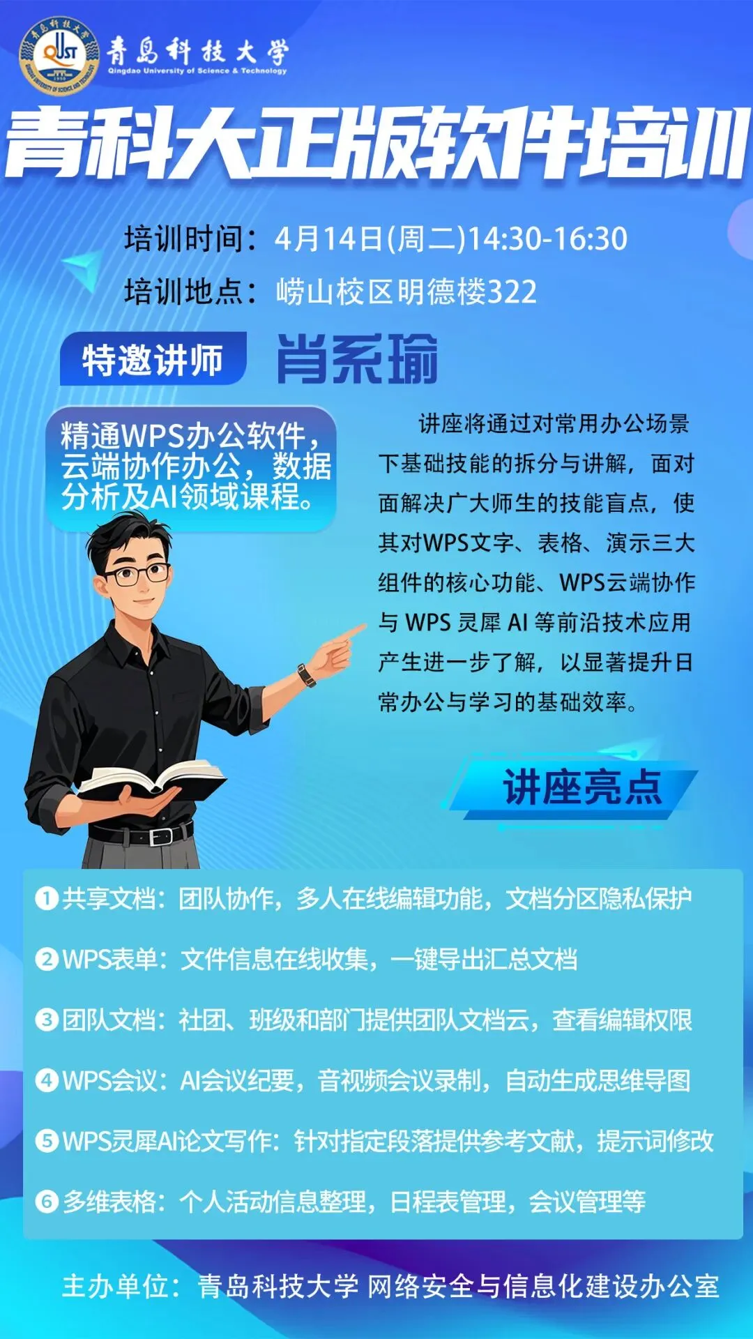 全校师生注意啦!为了帮大家彻底攻克办公技能盲点,玩转WPS核心功能,学校定于4月14日(周二)下午开展正版软件培训,全程干货无废话,手把手带你解锁WPS文字、表格、演示三大组件,吃透云端协作+灵犀AI黑科技,让学习、工作效率直接翻倍,不管是学生党写作业、做答辩,还是老师办公、备课、做教研,都能轻松搞定!