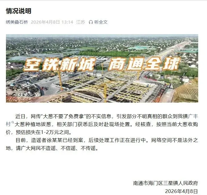 南通市海门区三星镇人民政府4月8日发布情况说明:近日,网传“大葱不要了免费拿”的不实信息,引发部分不明真相的群众到我镇广丰村大葱种植地拔葱,相关部门获悉后及时赴现场处置。经核查,按照当前大葱收购价,预估损失在1-2万元之间。目前,造谣者徐某某已经到案,后续处理工作正在进行中。网络空间不是法外之地,请广大网民不造谣、不信谣、不传谣。