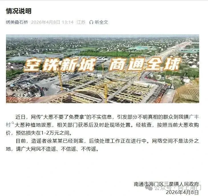 南通市海门区三星镇人民政府4月8日发布情况说明:近日,网传“大葱不要了免费拿”的不实信息,引发部分不明真相的群众到我镇广丰村大葱种植地拔葱,相关部门获悉后及时赴现场处置。经核查,按照当前大葱收购价,预估损失在1-2万元之间。目前,造谣者徐某某已经到案,后续处理工作正在进行中。网络空间不是法外之地,请广大网民不造谣、不信谣、不传谣。