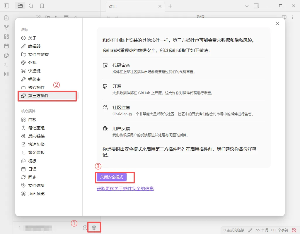 在主界面的左下角看到一个齿轮图案,点它,然后弹出设置框,选择【第三方插件】,在右侧最下方选择【关闭安全模式】。一定要关闭安全模式才可以下载插件,切记。如图按步骤①②③操作