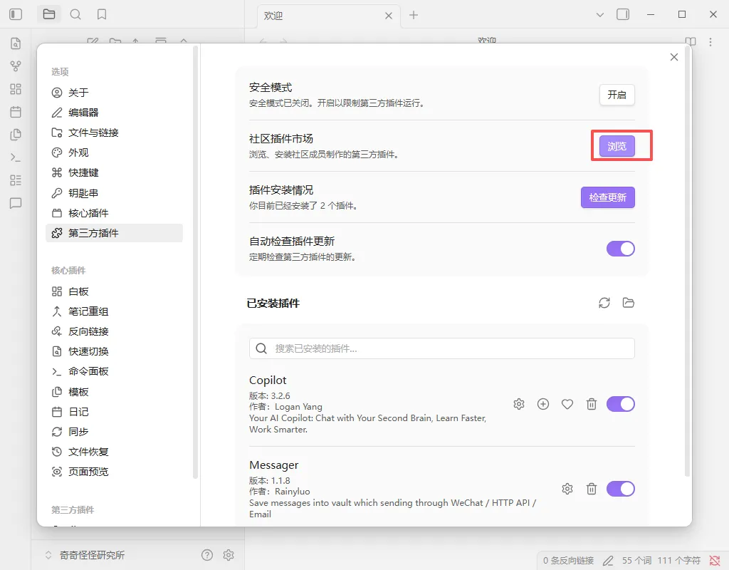 关闭安全模式后看右侧中间的【社区插件市场】点【浏览】,如下图所示
