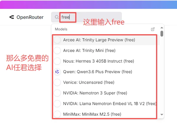 下载好以后,去https://openrouter.ai/这个网站,用github的账号登录。如何注册github账号可以看我这一篇手把手教你注册github(解决访问受限版)登录后,你在网页的左上角去搜索【free】,会出来好多免费的ai。