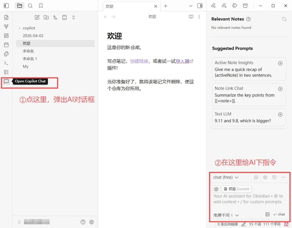 设置完成你会发现obsidian打开页面左边多列一个对话框图案,点进去,右边会弹出一个AI对话框。