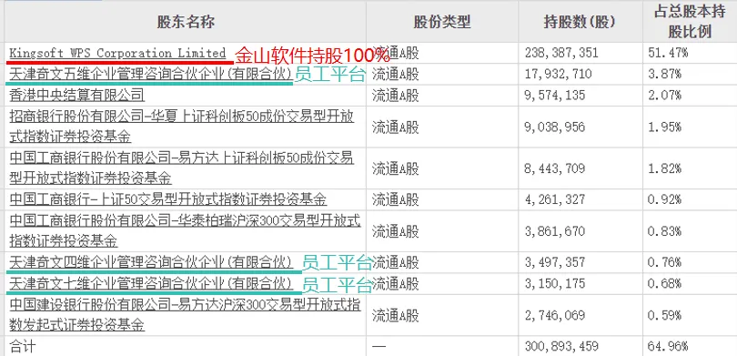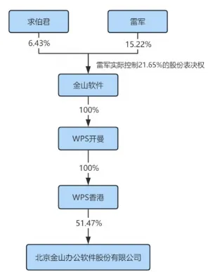 股权结构差不少是这样的,雷军和求伯君持股21.5%金山软件 ,金山软件100%持股WPS,WPS持股51.5%金山办公;