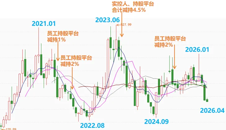 实控人在2023年那波高位和员工持股平台合计减持了 4.5%,员工持股平台频繁减持,合计减持了有9%左右;