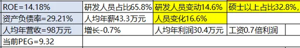 净资产收益率14%是不高的,主要是公司手上拿了大笔的钱,都存定期了,这个周期效率就低了,要不然这种公司净资产收益率会非常高,研发人员占比66%,研发人员是核心,软件的命脉就是靠人研发出更好的软件功能,硕士以上人员占比33%,30-40岁研发人员占比48%,2025年研发人员增长15%,整体人员增长17%,资产负债率29%,非常低,基本没什么负责,员工的整体薪水还是比较高的,相对整体利润会低一些,这是高阶知识分子的聚集地;