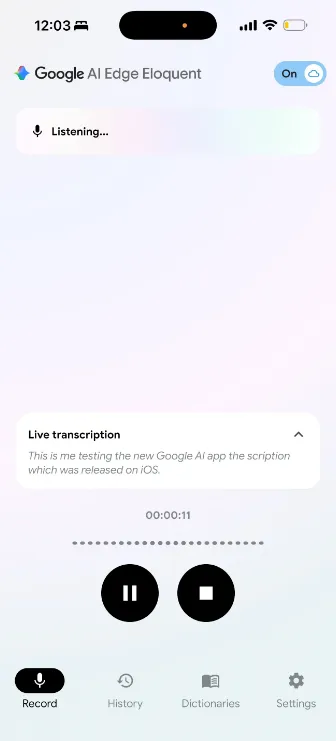 谷歌在App Store介绍中写道:“Google AI Edge Eloquent是一款高级听写应用,旨在打通自然语音与专业即用文本之间的壁垒。与逐字记录磕巴和语气词的普通听写软件不同,Eloquent利用AI捕捉你真正想表达的含义。它会自动剔除‘um’‘uh’等语气词与句中自我修正内容,输出干净、准确的文字。”