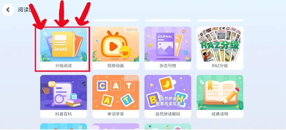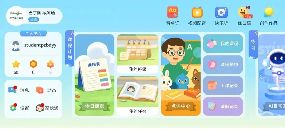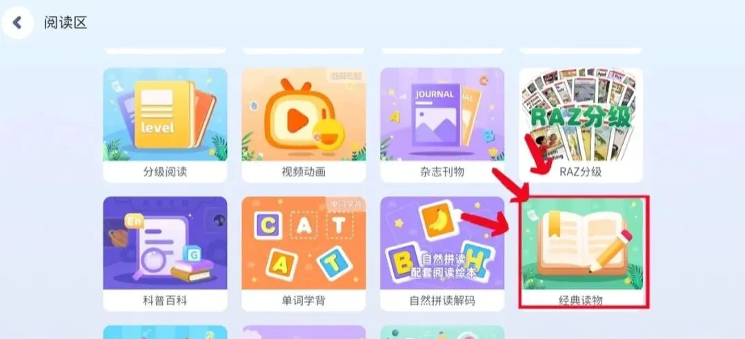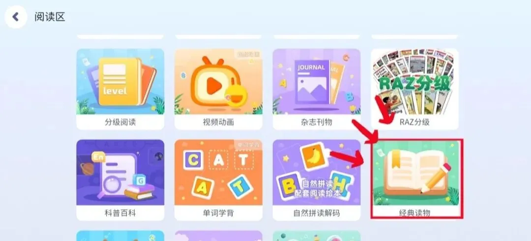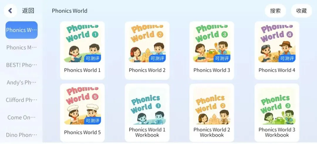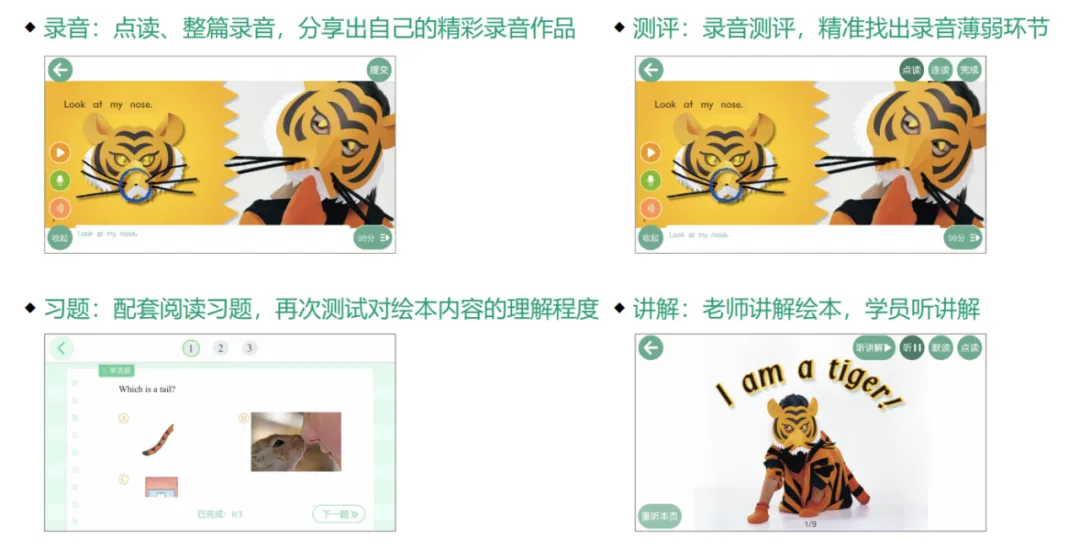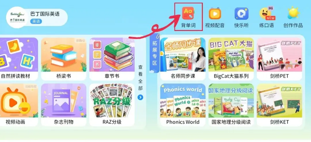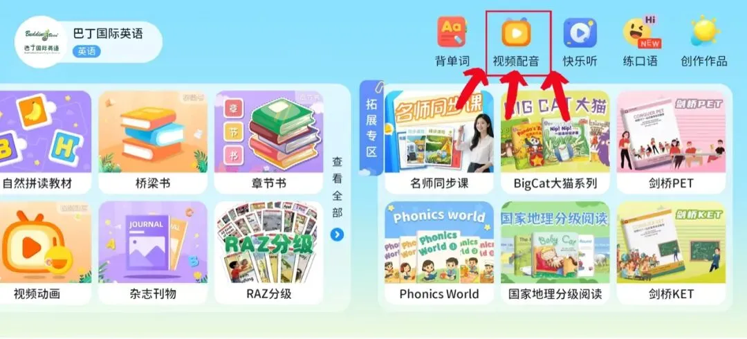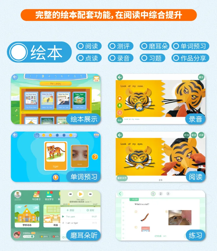 这款APP拥有丰富的线上学习资源,包含原版歌谣、原版动画、分类词汇书、经典绘本阅读与语音测评、自然拼读、校内同步教材点读与语音测评、校内教材习题库、考试类教材点读与语音测评、各类单词闯关、视频配音,PPT、综合练习等。