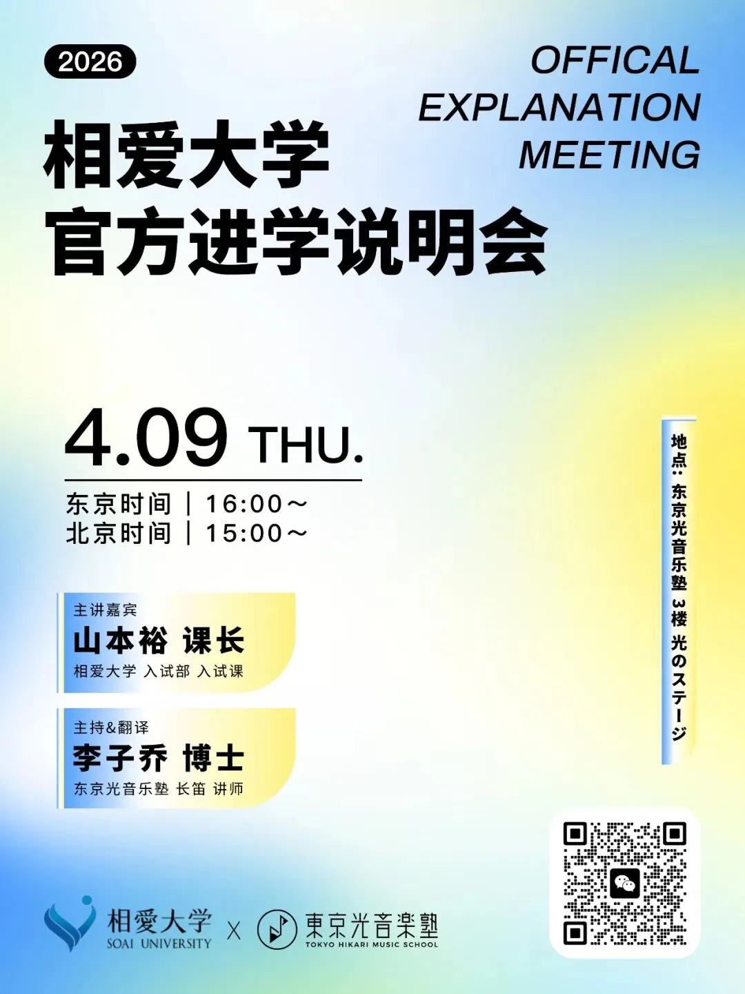 东京光音乐塾将联合相爱大学举办留学生升学指导说明会,面向有意报考相爱大学的同学,本次说明会将从「院校解析 × 入试策略 × 校园生活全景」三大维度,带你一次性搞懂考学关键。