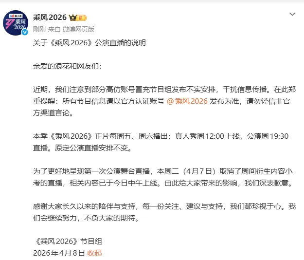 《乘风2026》发布关于公演直播的说明:原定公演直播安排不变