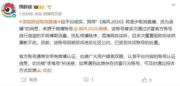 4月8日,@围脖侠通报,网传“《乘风2026》将逐步取消直播、改为录播”的消息,来源于微博账号@乘风2026微博,该账号曾多次通过仿冒官方账号进行造谣的手段博取流量,扰乱传播秩序,混淆网友视听,且多次重置昵称后依然屡教不改。目前,该账号因被投诉违反社区公约,已受到关闭账号的处置。
