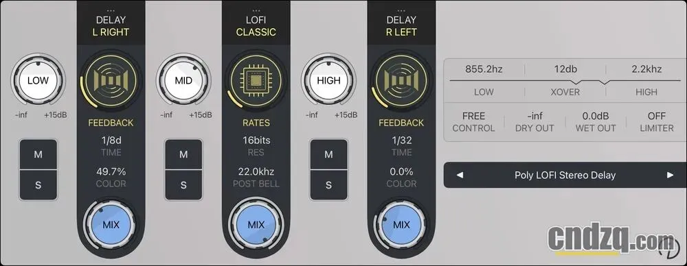 与前代产品一样,FAC Bandit 2 将输入的音频信号拆分为三个独立的频段,每个频段均可单独处理,随后在插件的输出阶段重新组合; 各频段的范围可通过一对分频点进行设置,斜率值范围从 6dB/八度到 48dB/八度。每个频段均可使用饱和器、LoFi、环形调制器、延迟和混响处理器,且所有效果现均作为标准配置提供,而非通过应用内购买获取。
