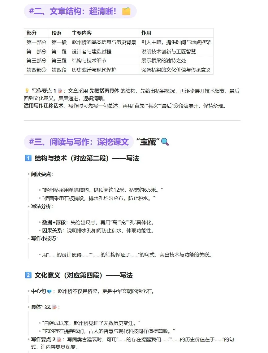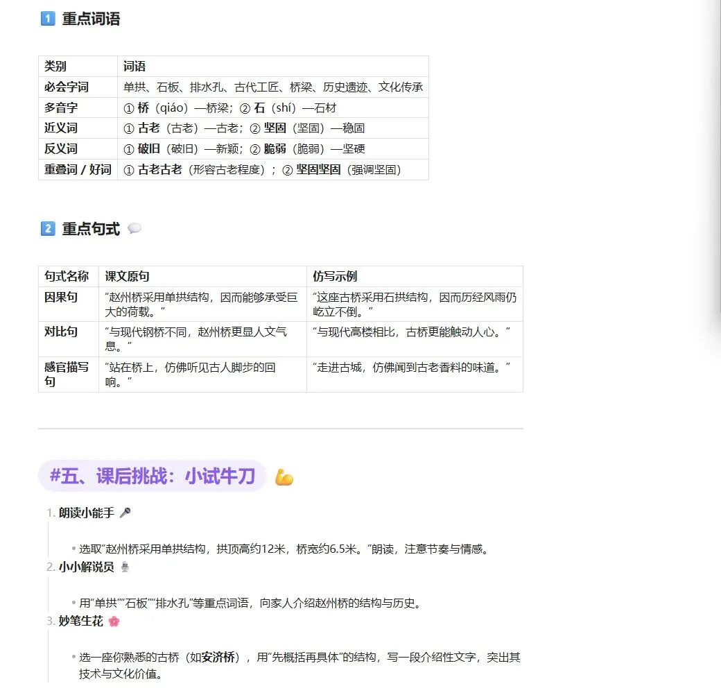 用月大的小虾模版给豆包后,让他按着模版给我生成了一份赵州桥的笔记📝