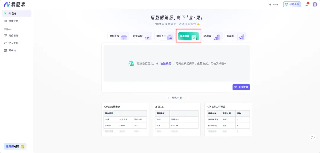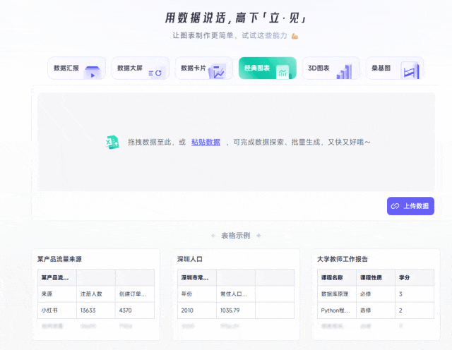 打开官网的制作界面,选择经典图表,然后将你的数据表格上传到这里就行。