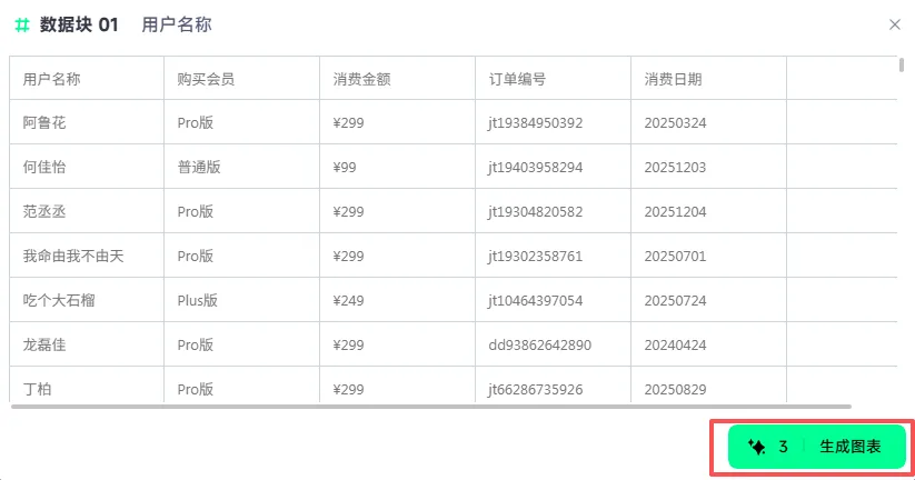 比如我的这份用户购买会员订单的表格,就分别生成了五种数据图表: