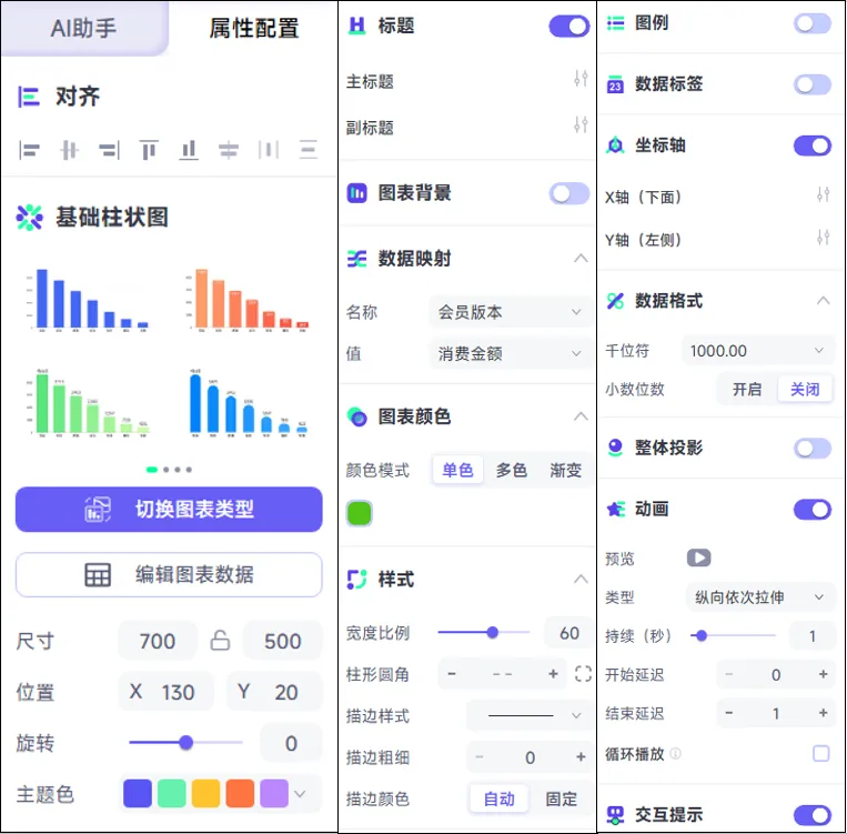其他的都是一些动画、标题、图表、样式等等的修改,几乎图表中你能看到的各项元素,它都支持修改,甚至连一些细节参数也能调整。