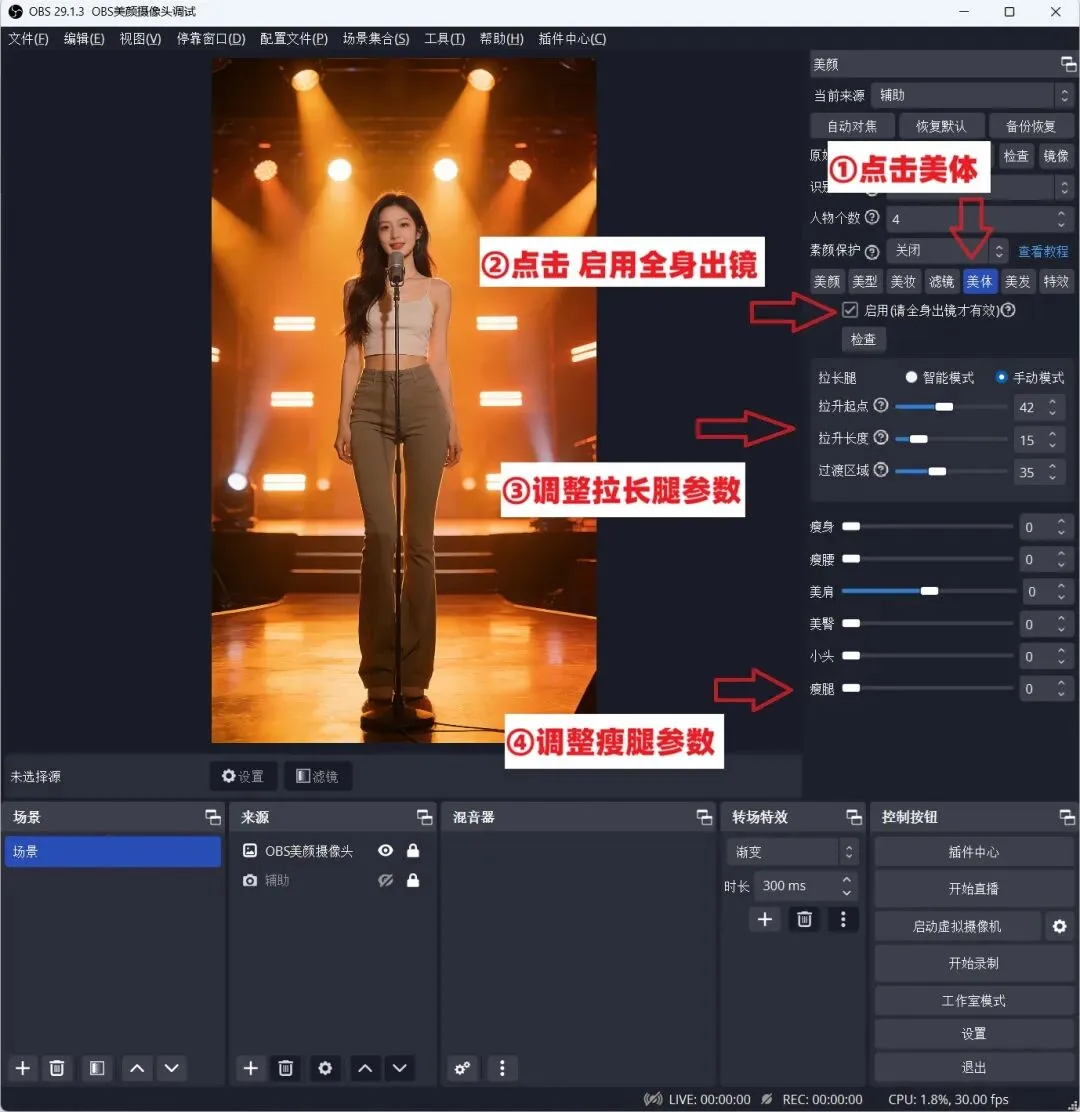 OBS美颜插件瘦腿拉长腿特效使用教程:OBS美颜插件如何瘦腿?如何开拉长腿效果?