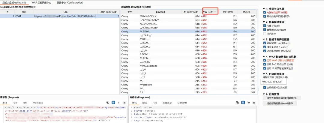 Content-Length来判断是否绕过成功。一旦遇到服务器开启了 GZIP 压缩,长度每次都在变,扫出来几百个“成功”,挨个看全都是误报,极其浪费生命。 -