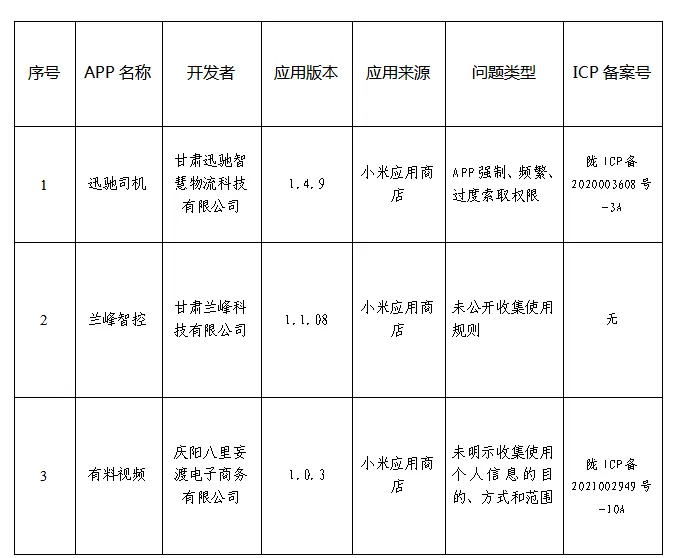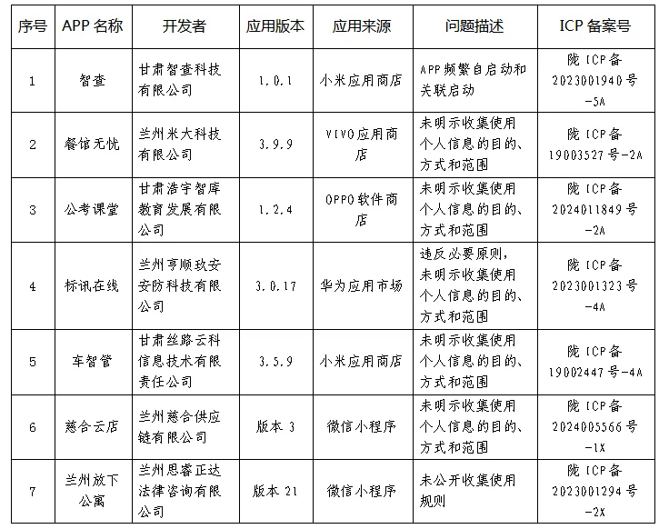 根据《中华人民共和国网络安全法》《中华人民共和国个人信息保护法》等法律法规,按照“关于开展2026年个人信息保护系列专项行动的公告”工作要求,甘肃省通信管理局近期对省内APP及小程序进行了抽测,现将存在侵害用户权益行为的应用程序通报如下: