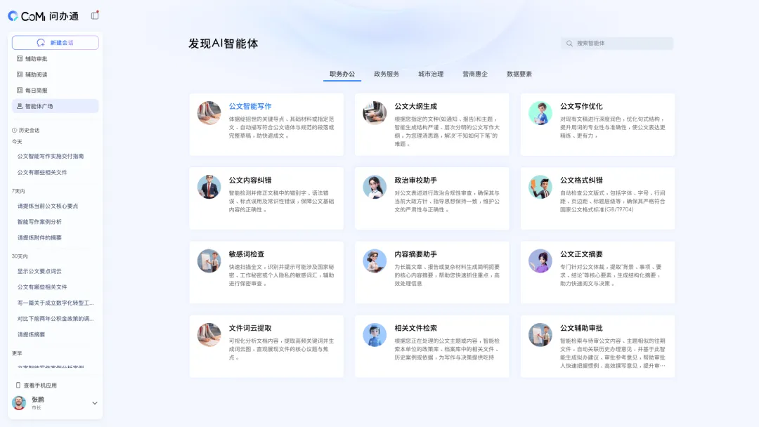 “问办通”作为数智机关智能入口,融合了高质量的政务政策与公文知识库,能够实现“一句话问办”、“一句话问政”、“一站式办公”等基础操作,它并非单一工具,而是一个开箱即用的智能体集合,既可嵌入已有协同办公平台作为智能入口,也可在传统数字机关应用之上构建独立的智能化能力体系。