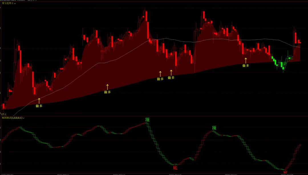 今天分享的指标是幅图指标,红绿多空柱,顶底信号(这部分有未来函数),下面是随机选取品种的截图效果。