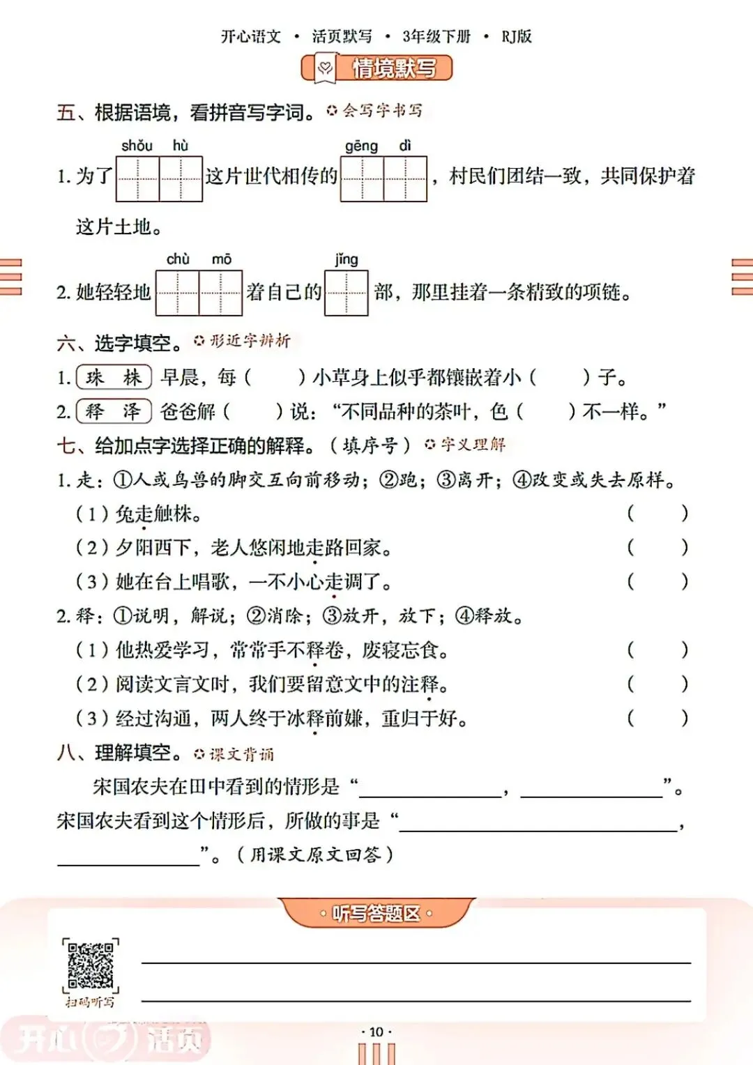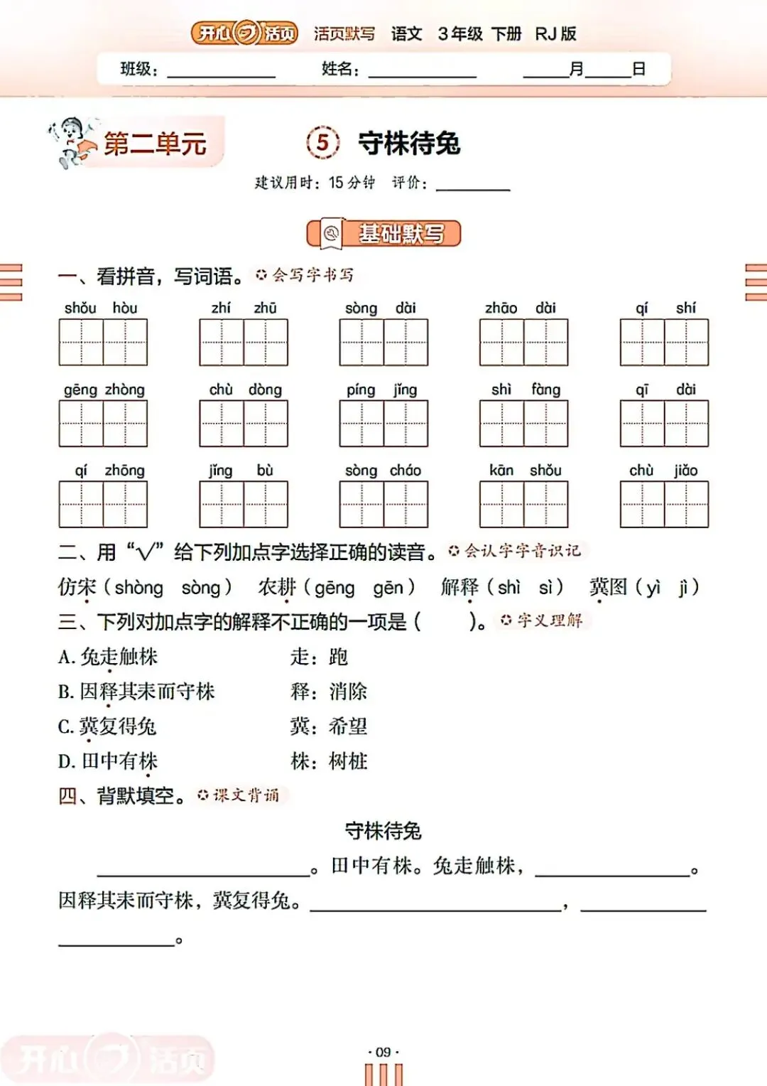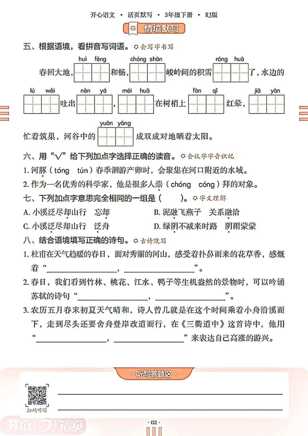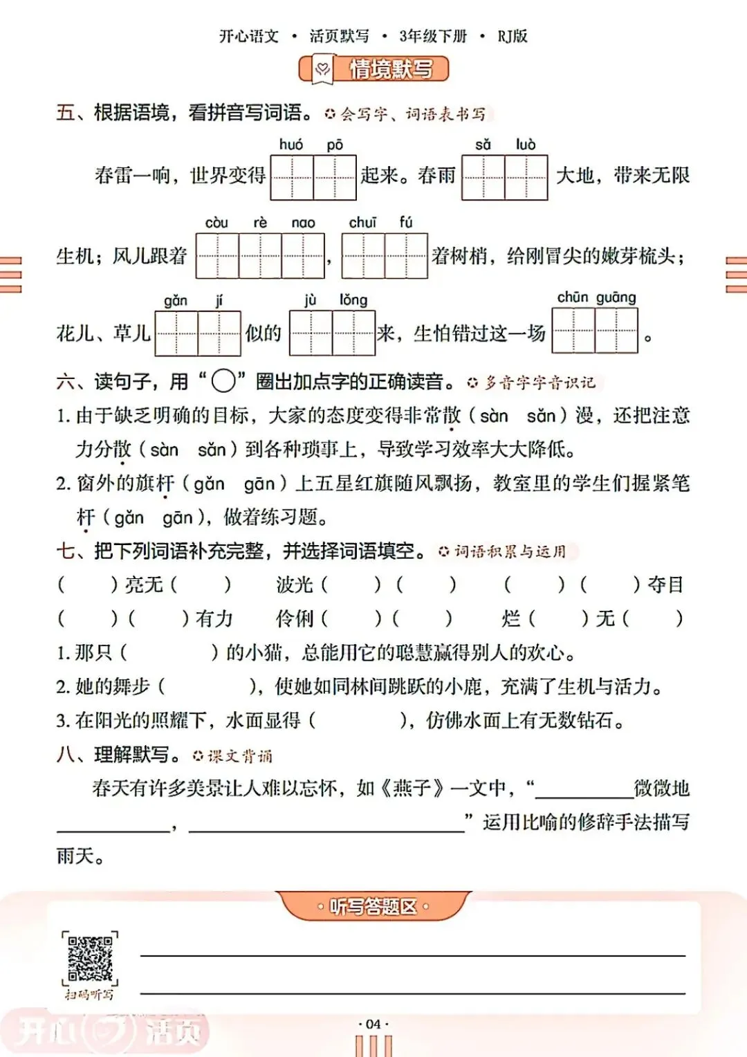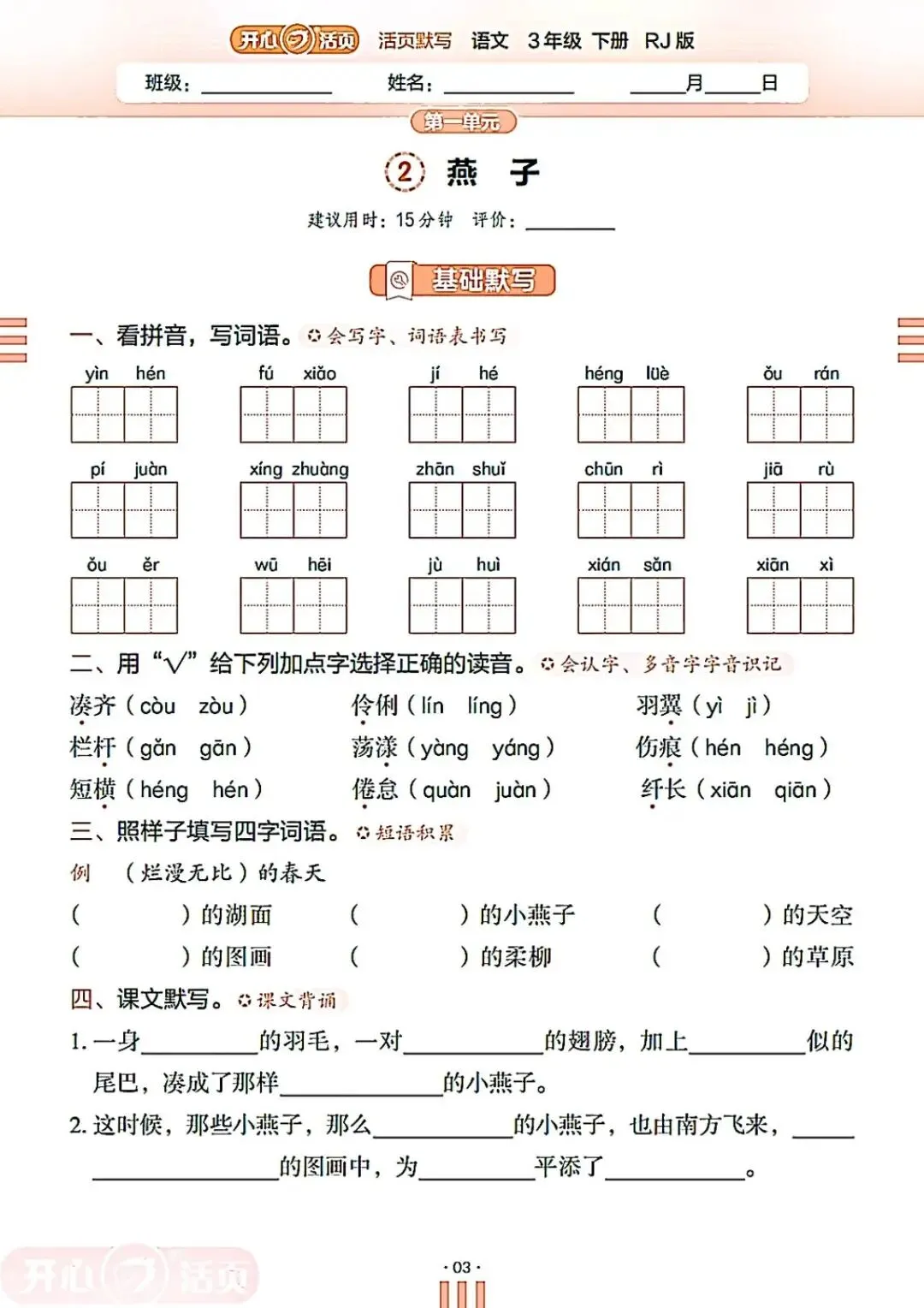 3年级下册语文《开心活页默写》(领高清PDF打印版)