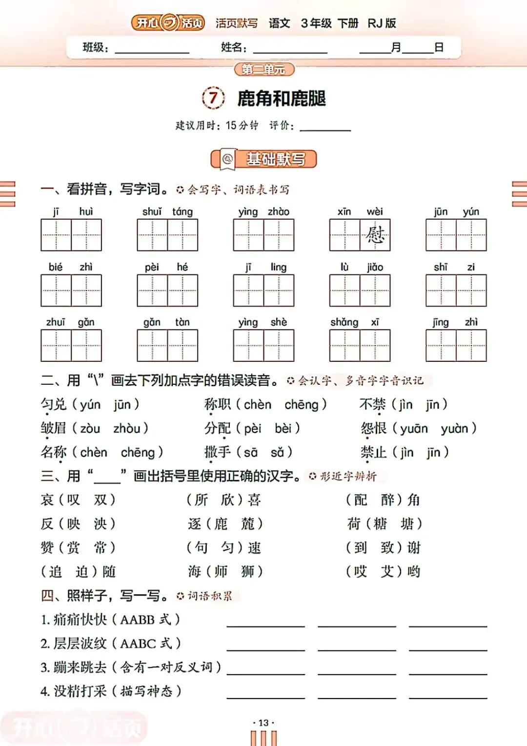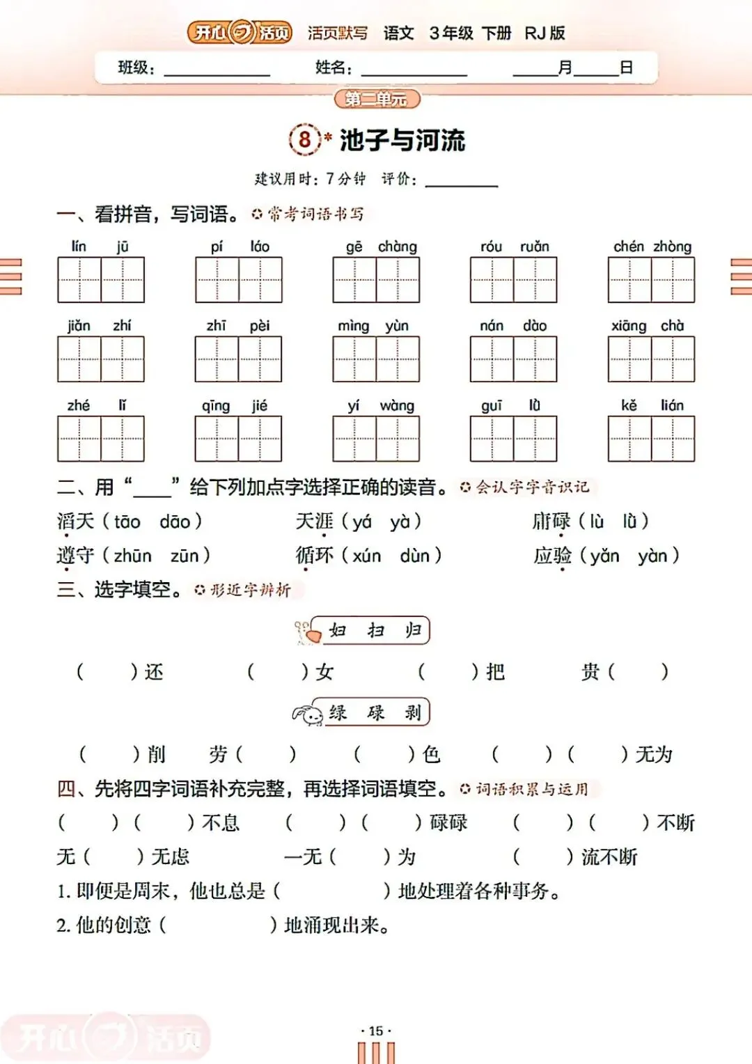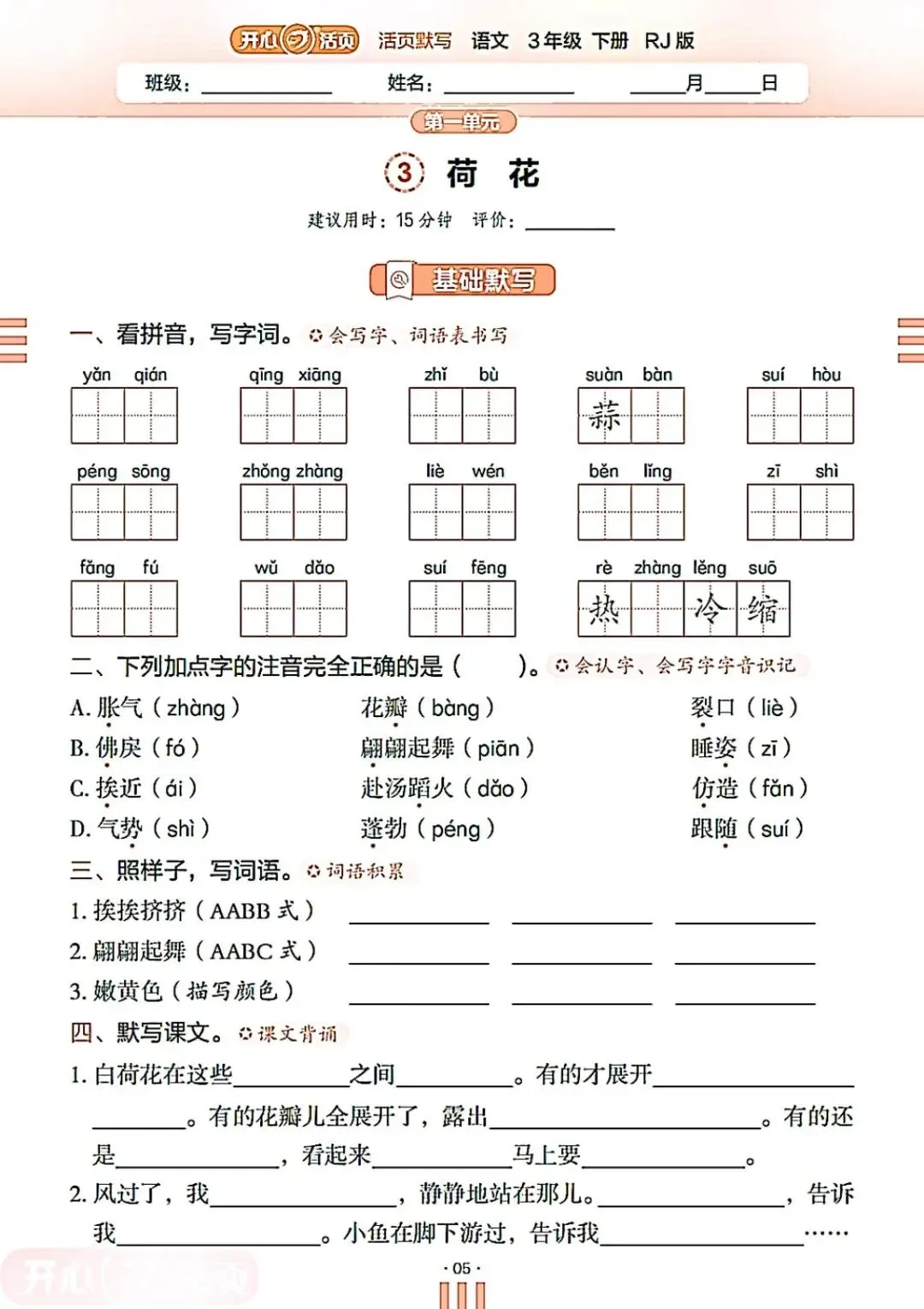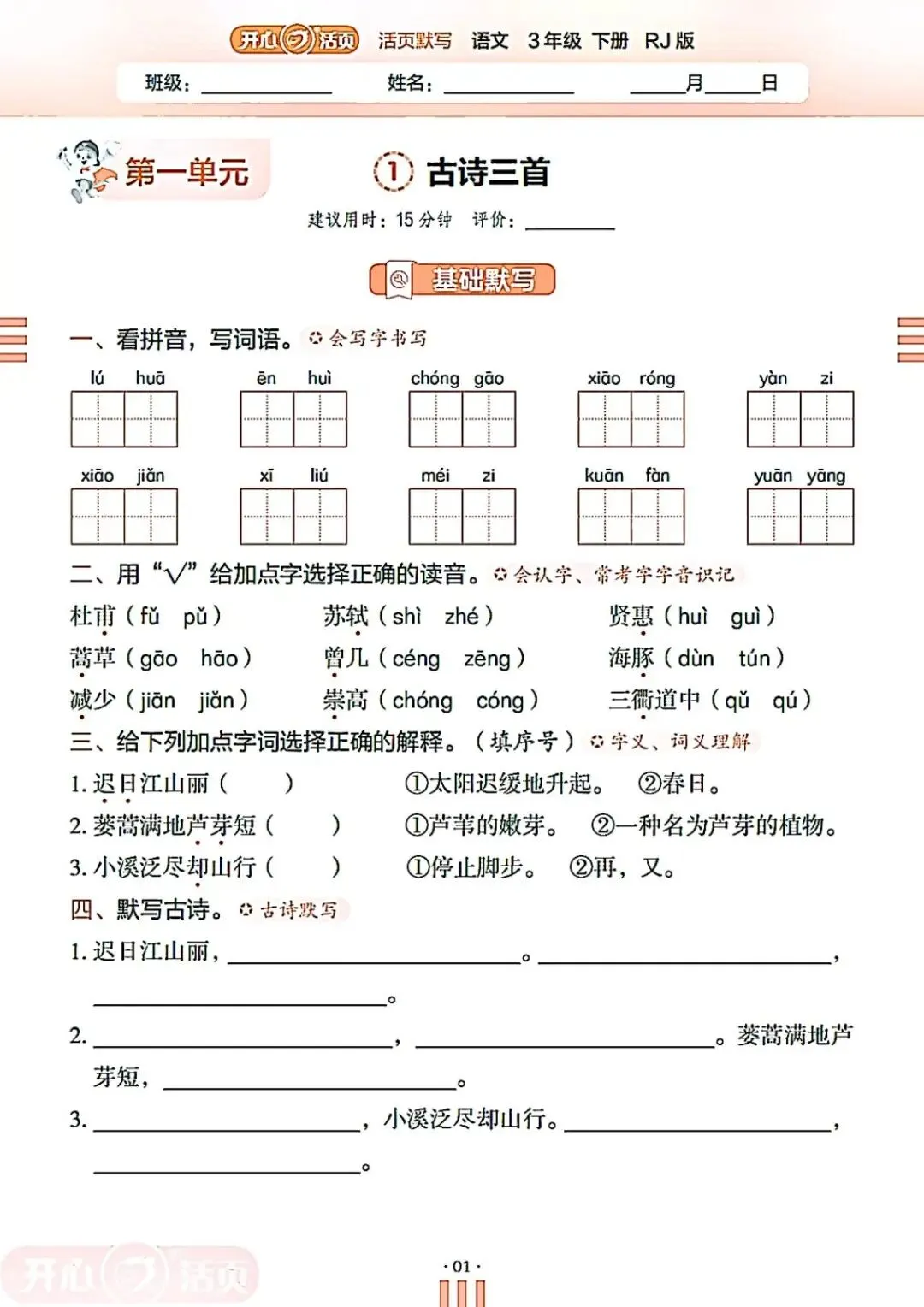 3年级下册语文《开心活页默写》(领高清PDF打印版)