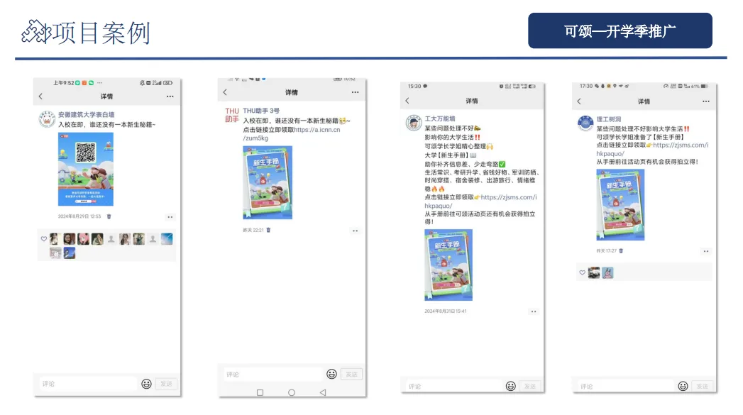 对接高校社群(学习交流群、娱乐分享群、二手交流群等),分享实用内容、适当植入产品优势,搭配社群专属福利,实现批量用户注册转化。