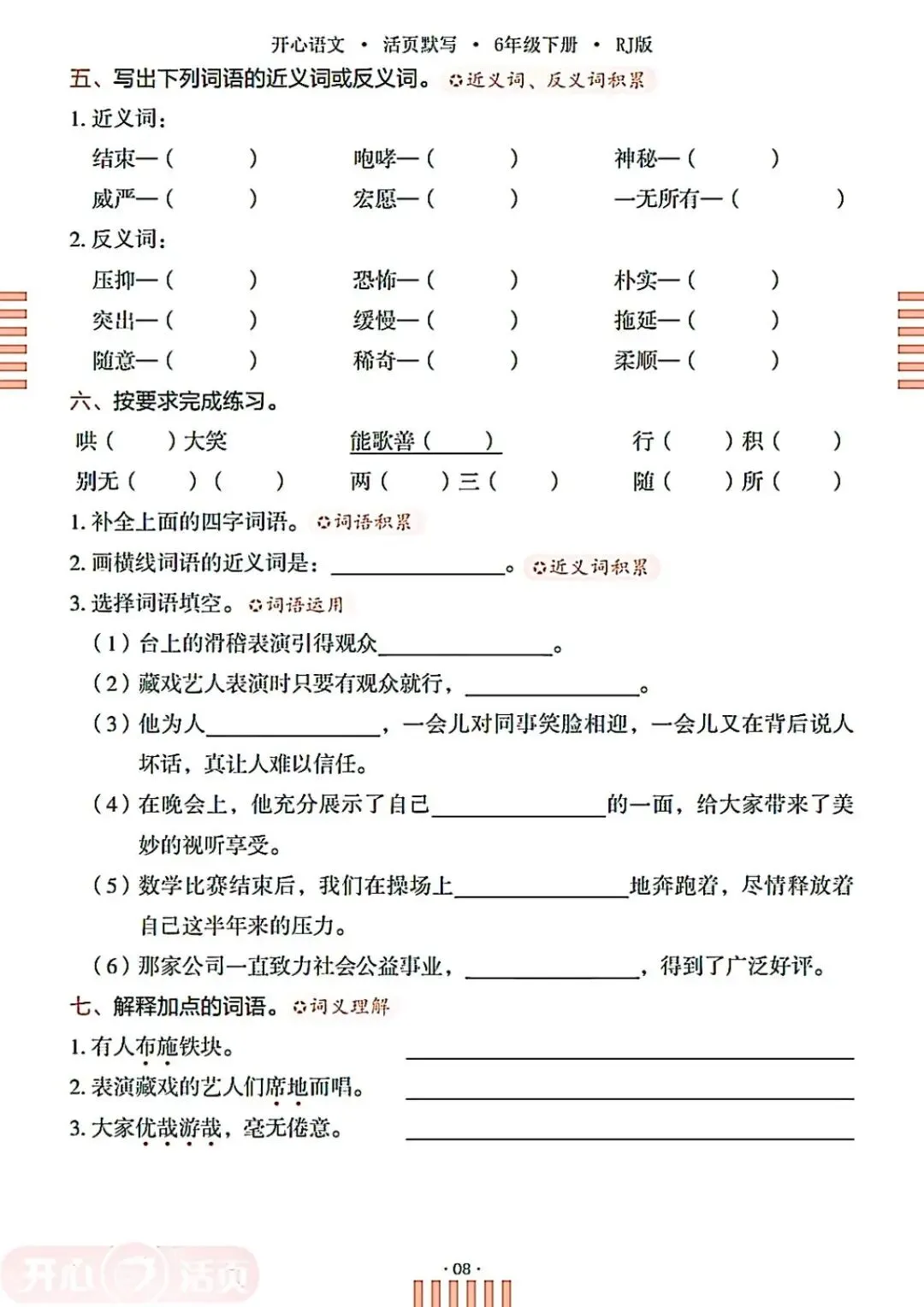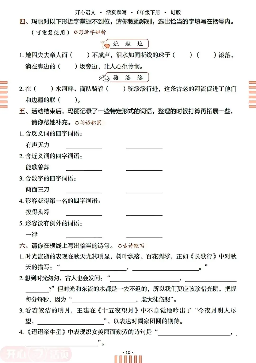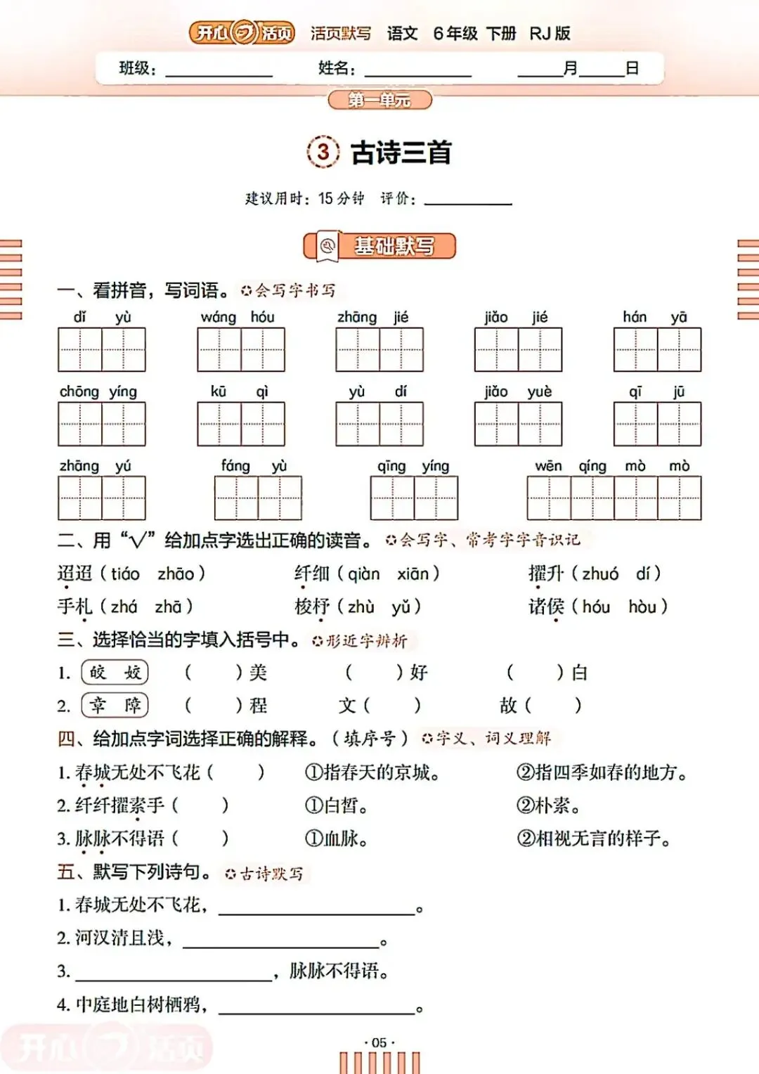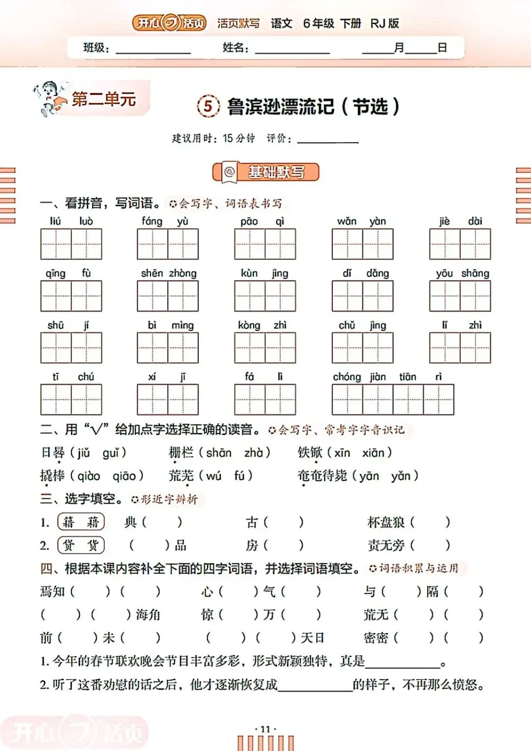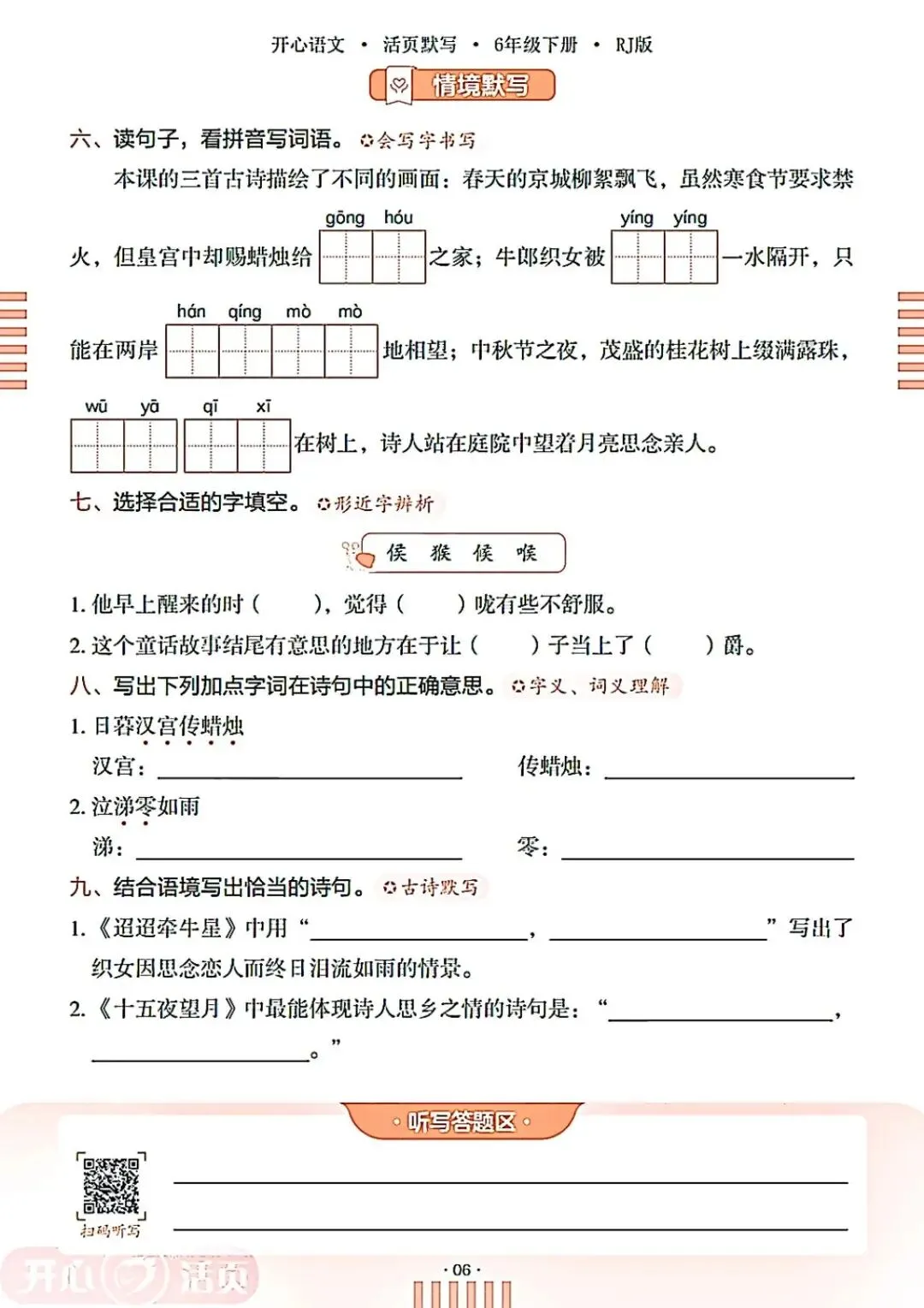 6年级下册语文《开心活页默写》(领高清PDF打印版)